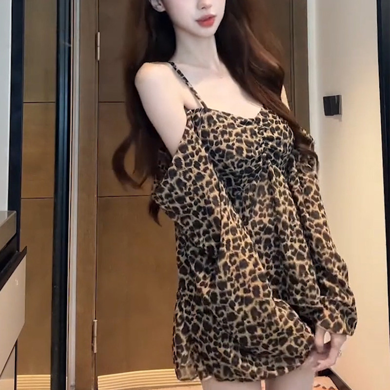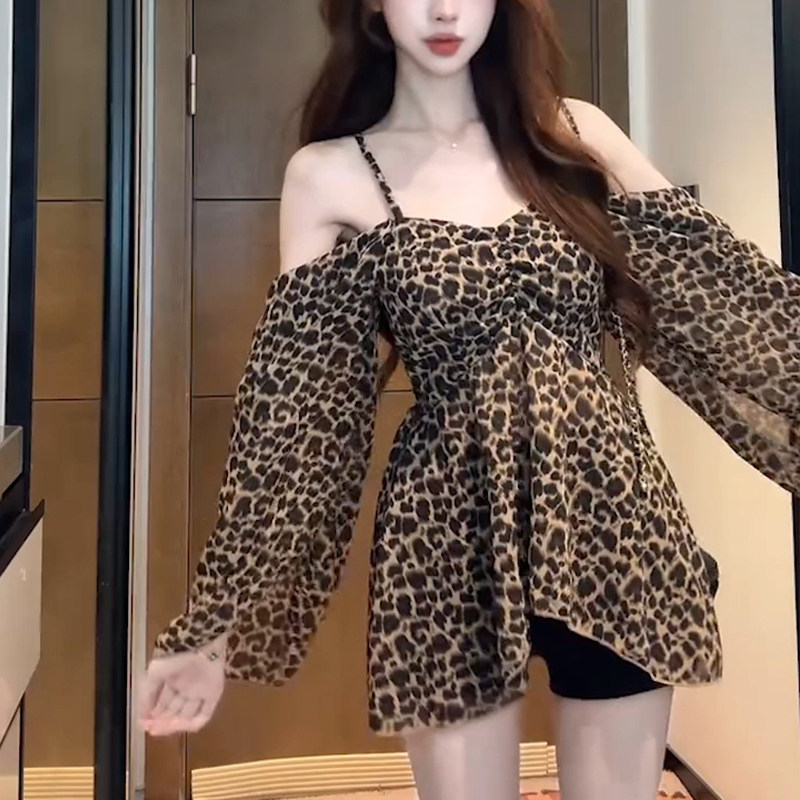 2025早秋新款豹纹吊带衬衫女设计感小众气质修身显瘦抹胸长袖上衣