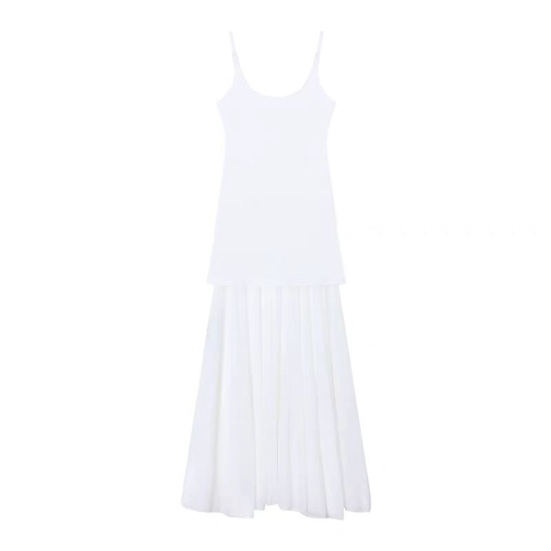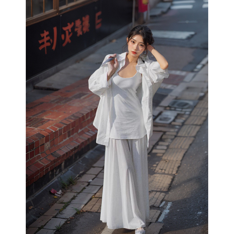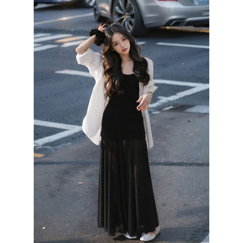 “淡人仙女裙 ”清冷艺术系拼接网纱吊带裙白色廓形长袖衬衫套装
