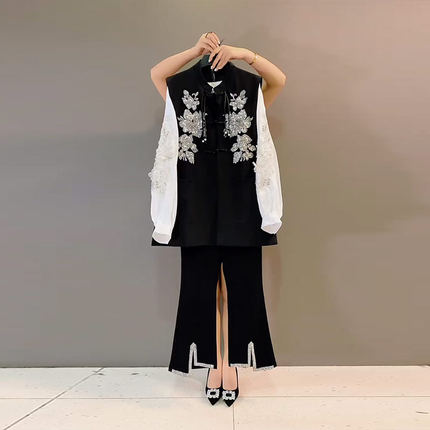 胖MM立领盘扣花朵国风马甲亮片长袖衬衫加大码女装显瘦遮肉休闲裤