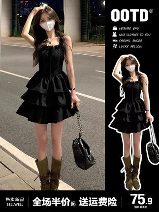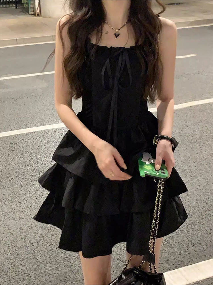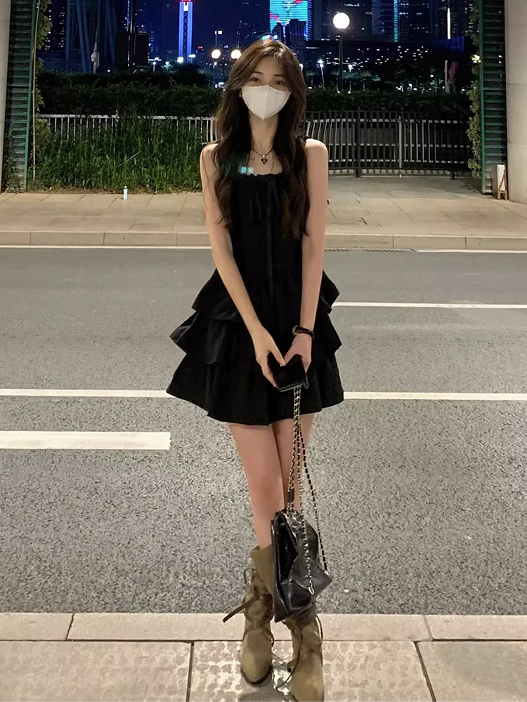 2024新款法式黑色赫本风吊带连衣裙子女春夏高级感公主蓬蓬小黑裙
