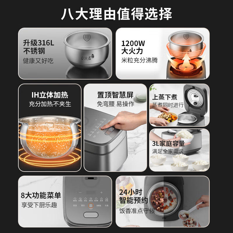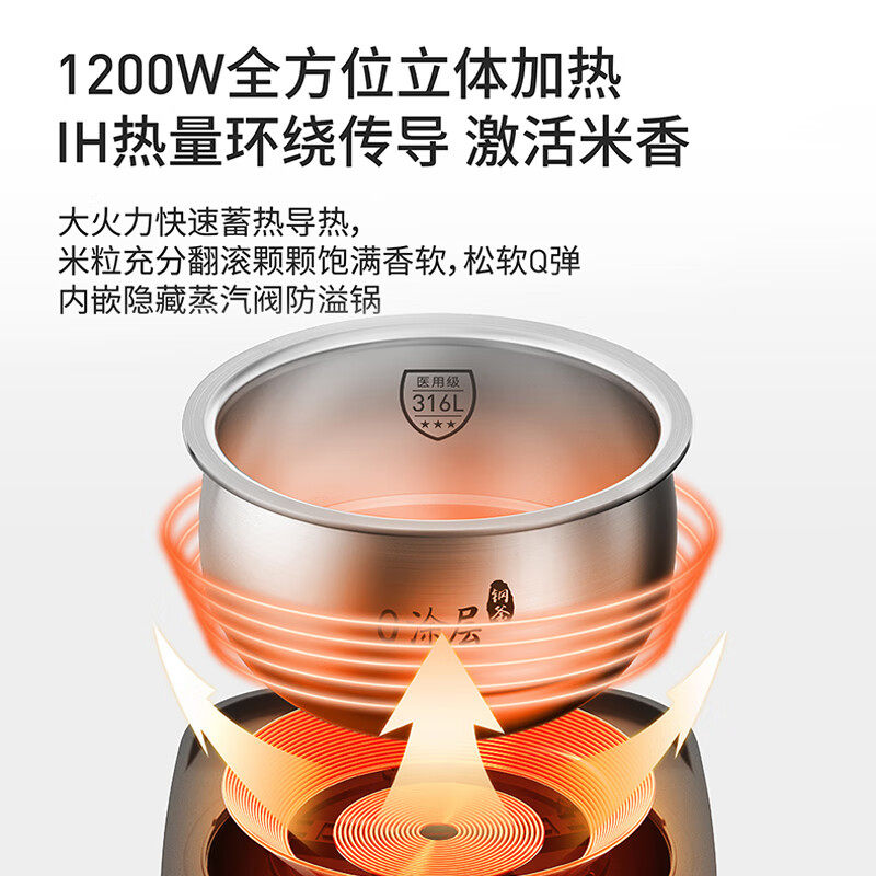 九阳电饭锅0涂层3L家用IH微压电饭煲316L不锈钢无涂层内胆30F315L