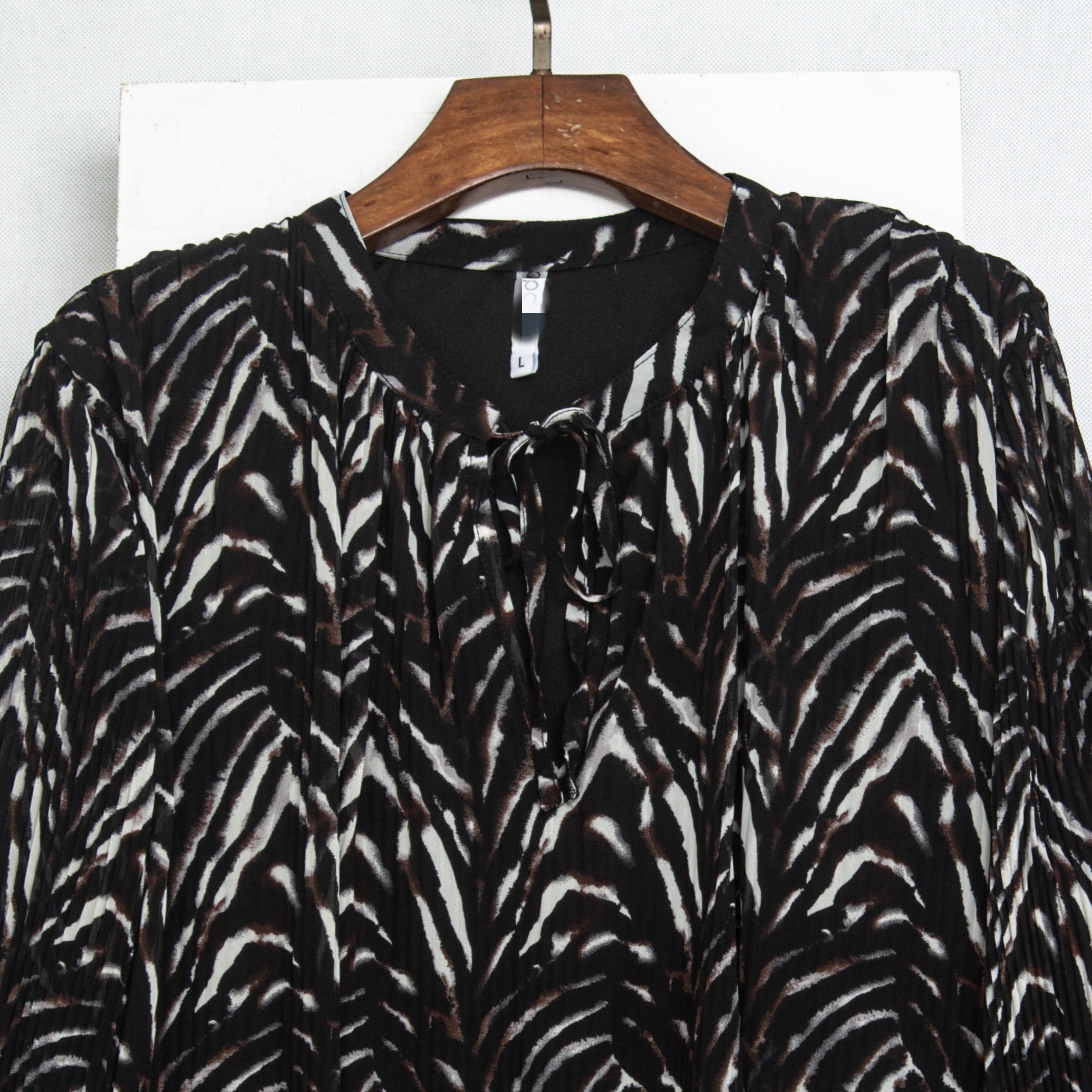 外贸单 斑马纹压褶雪纺连衣裙女 系带灯笼袖宽松显瘦遮肉中长裙