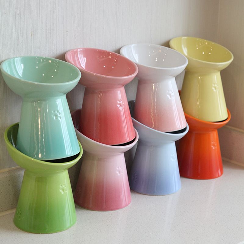 保护颈椎防打翻陶瓷外贸宠物碗渐变色彩高脚斜口碗中型猫食碗狗碗