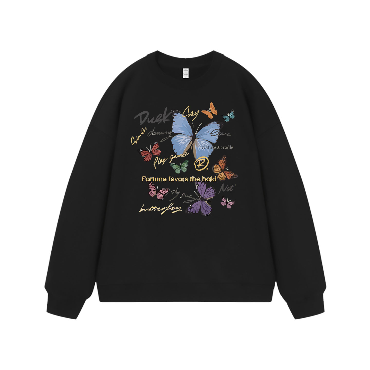 蔡文静明星同款卡通蝴蝶印花黑色圆领卫衣女2025小众设计感上衣潮