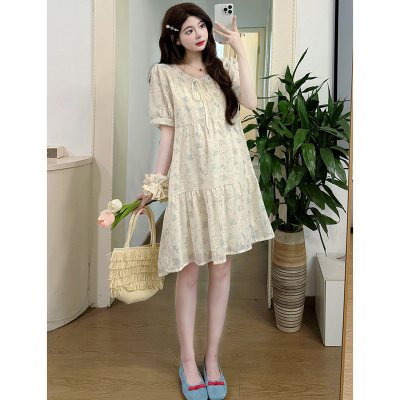 孕妇连衣裙夏季2025新款韩版蕾丝刺绣显瘦短袖系带裙小个子中长款