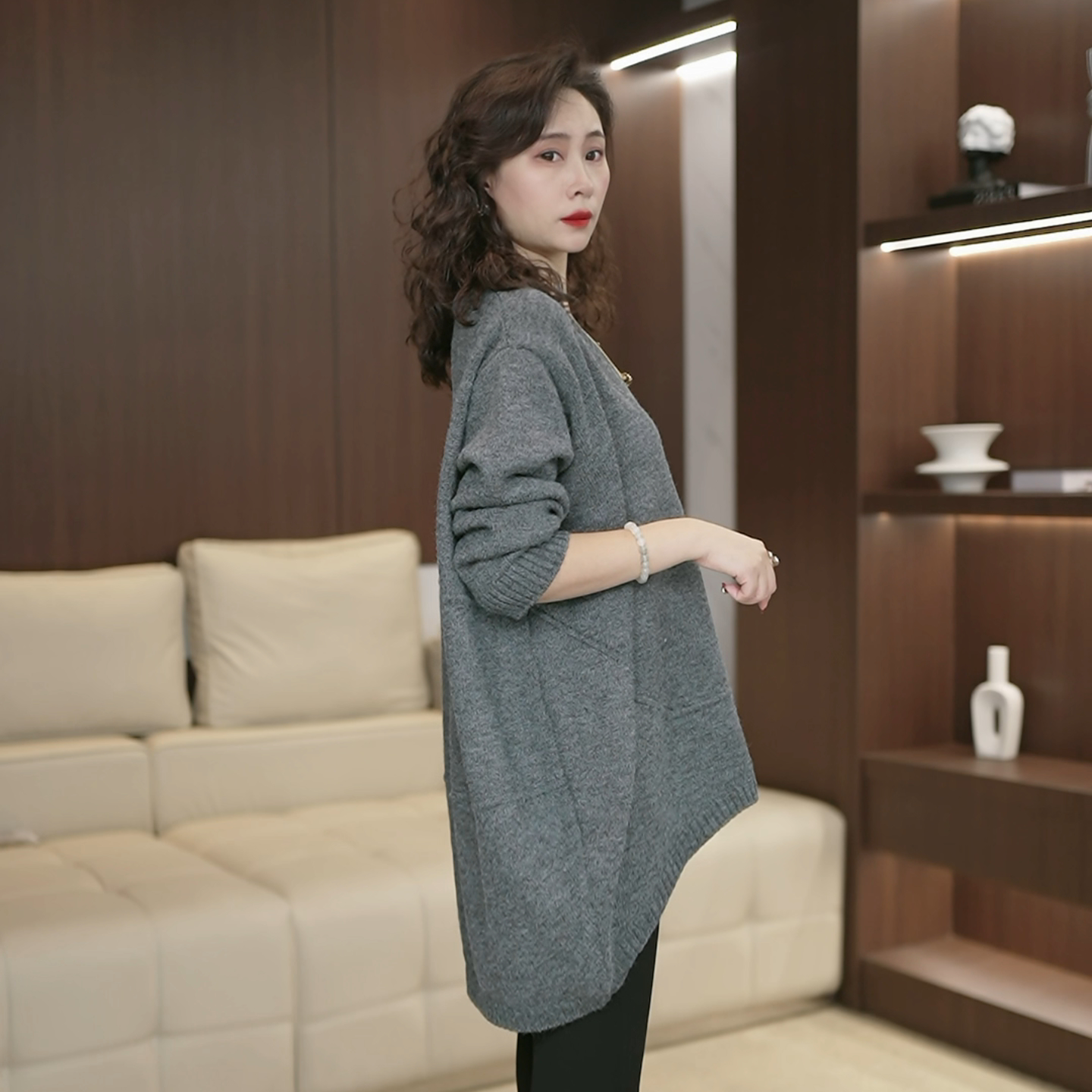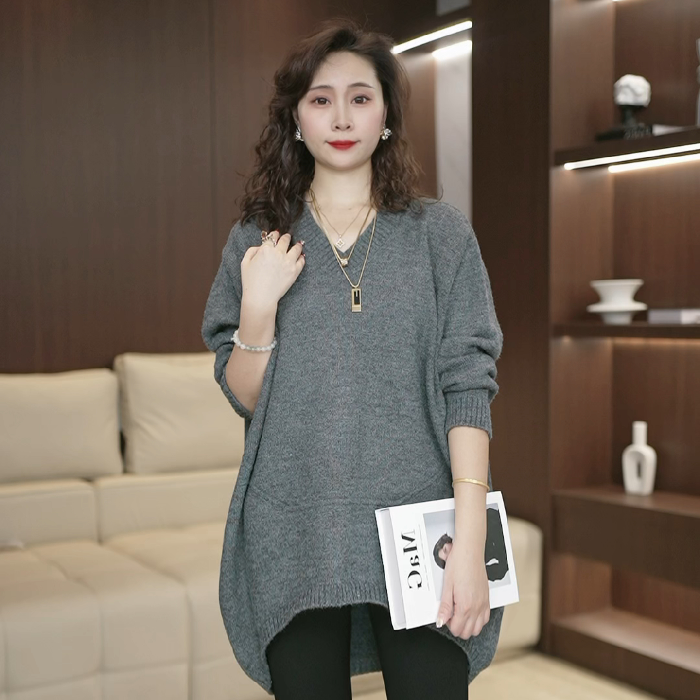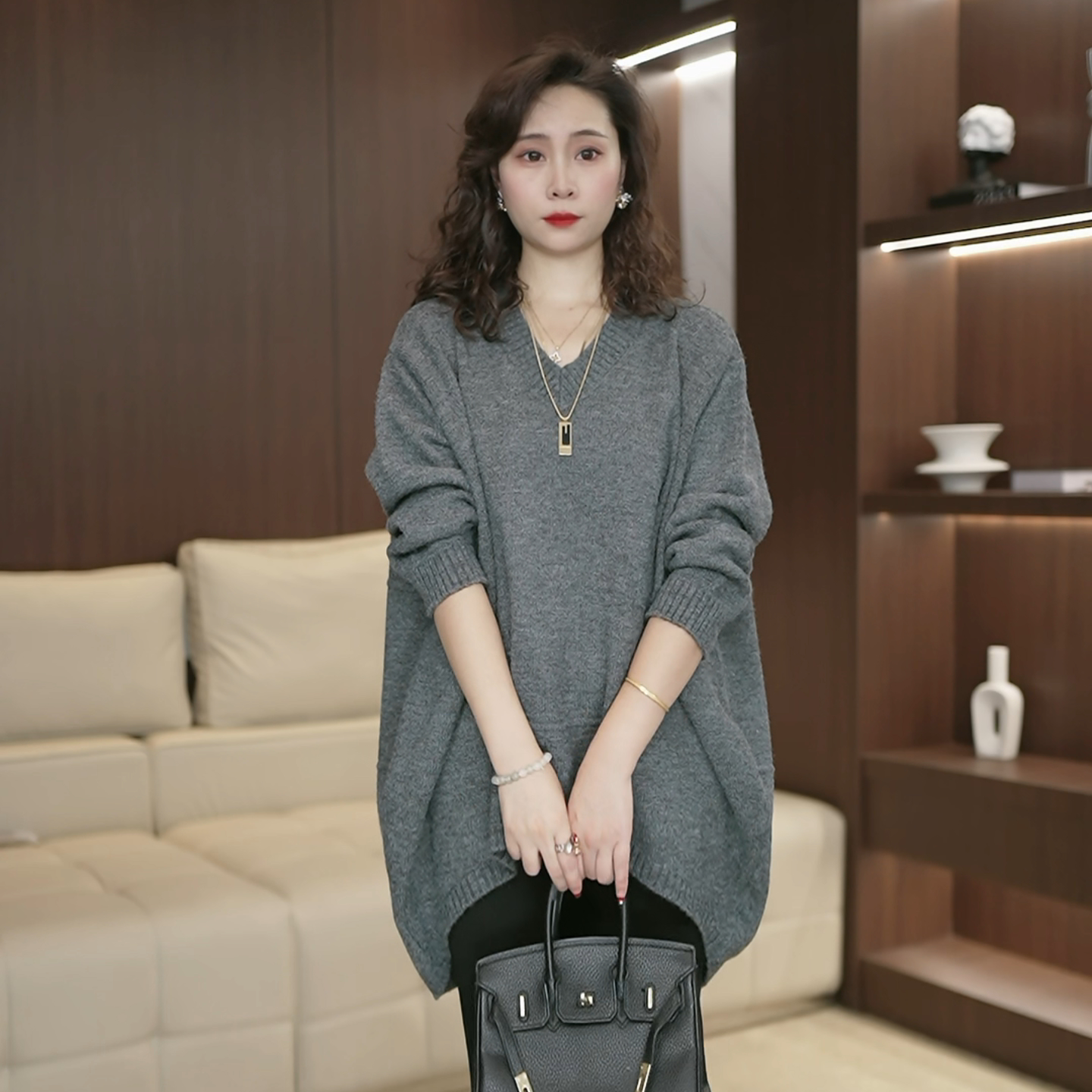 灰色v领毛衣女士秋冬慵懒高级感中长款遮屁股内搭针织衫上衣3642