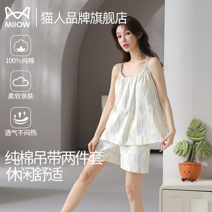 猫人睡衣女款2025新款纯棉夏季带胸垫吊带短裤套装薄款夏天家居服