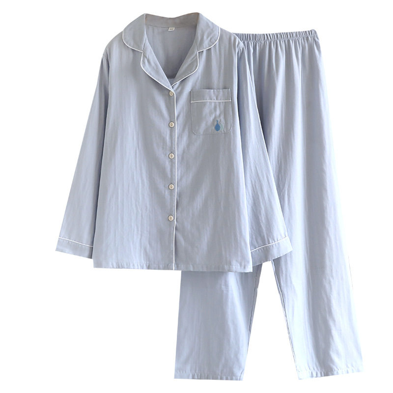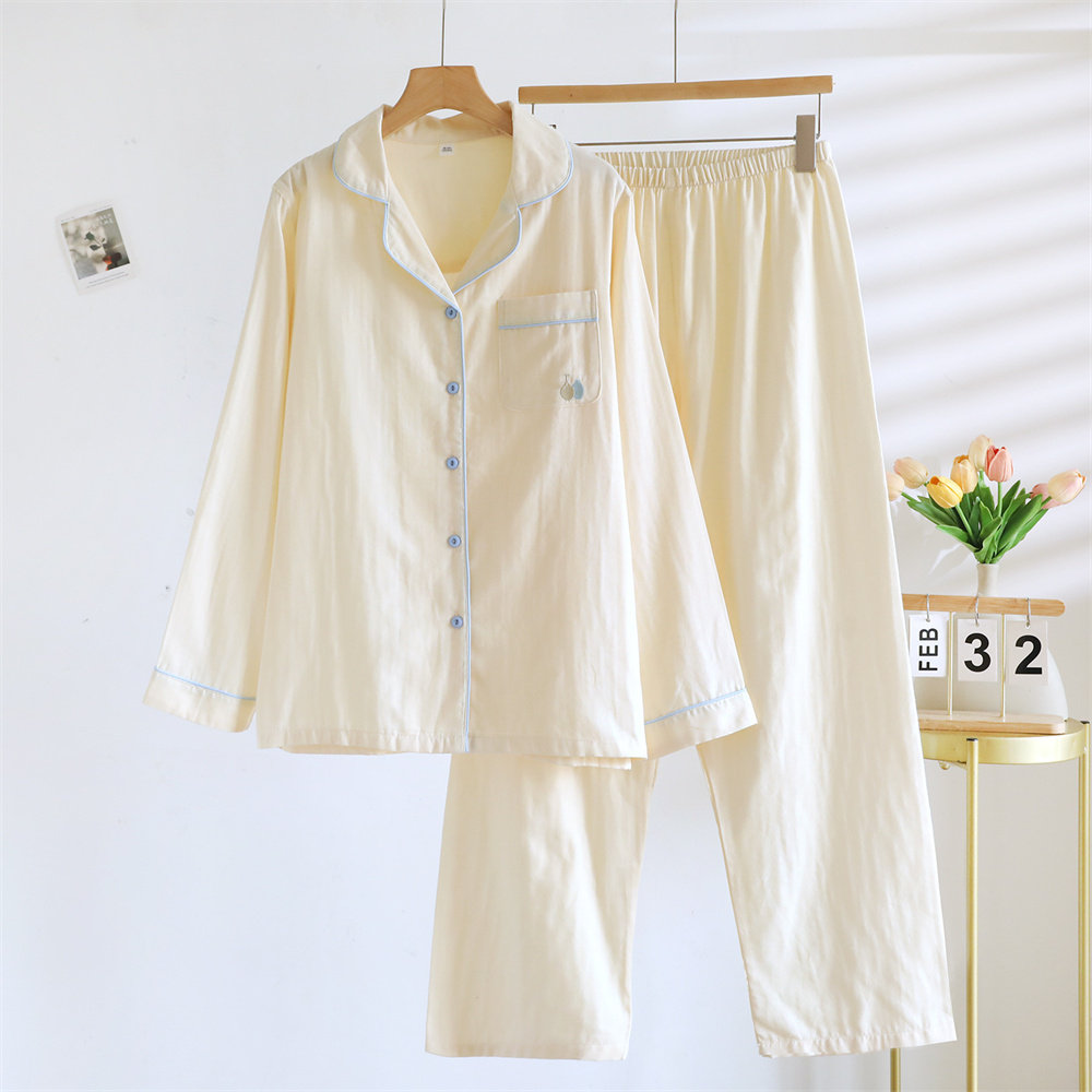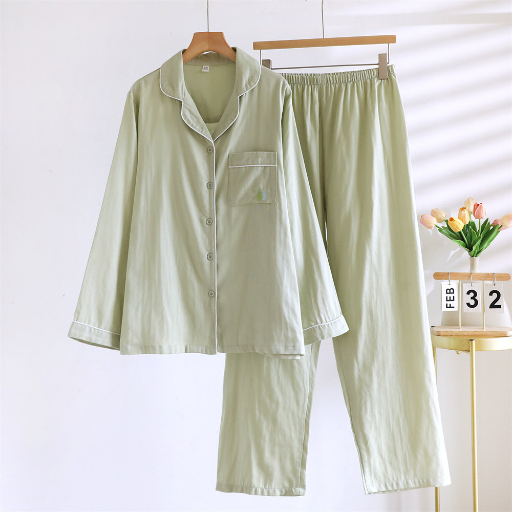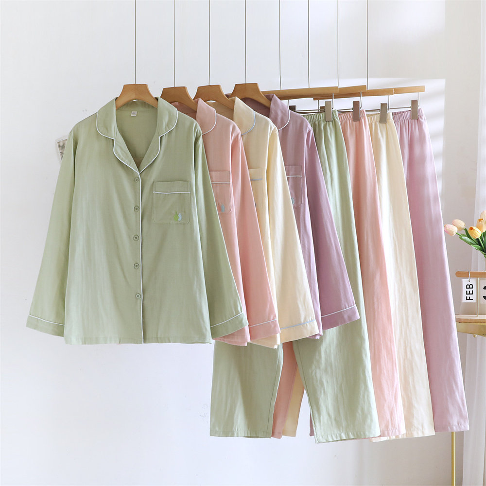 全棉女士睡衣纱布家居服套装长袖长裤宽松纯棉双层纱春夏薄款柔软