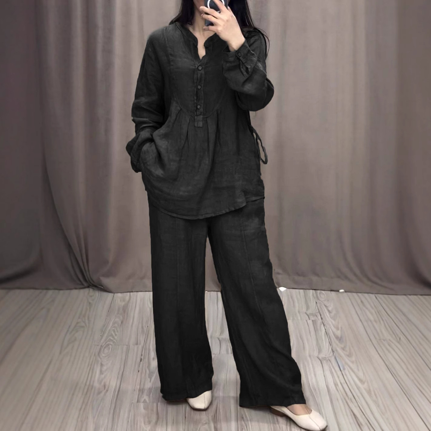 2025欧美秋季女士新款时尚舒适棉麻长袖半开襟休闲抽褶阔腿裤套装