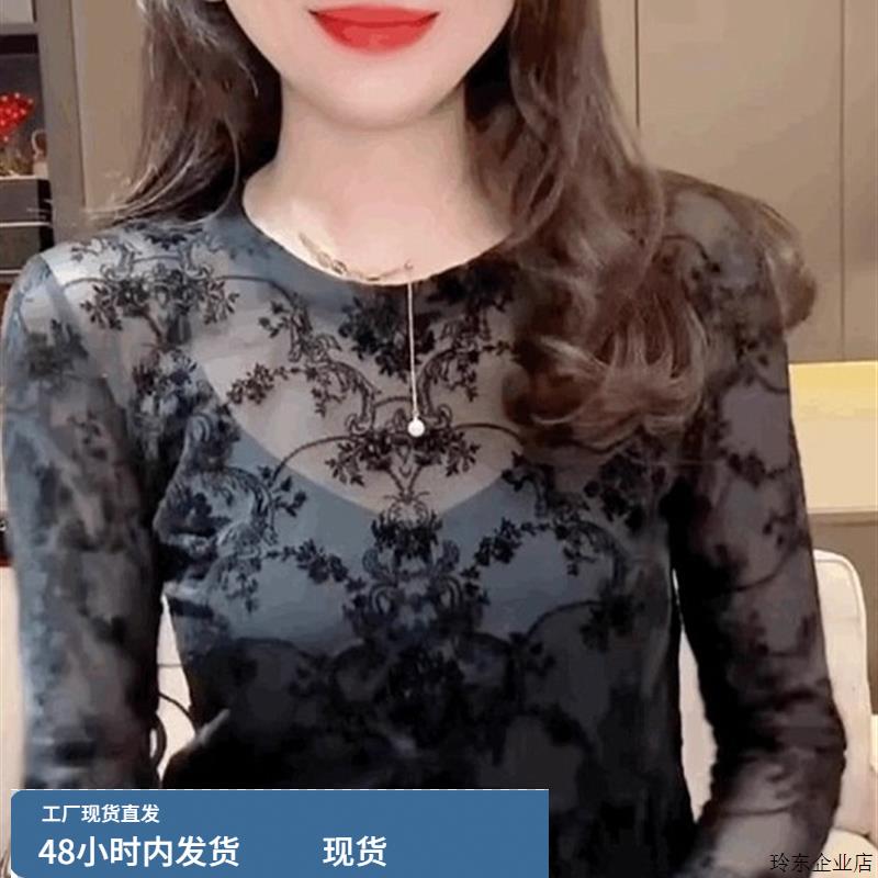 黑色蕾丝长袖T恤女透视网纱打底衫时尚气质显瘦百搭上衣2025欧货