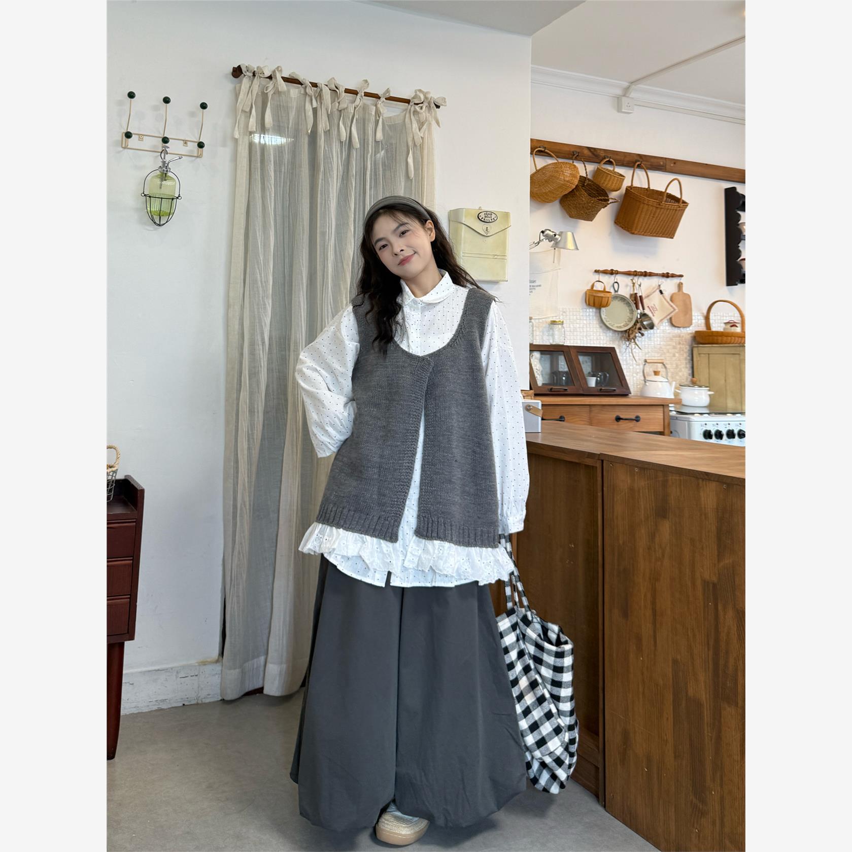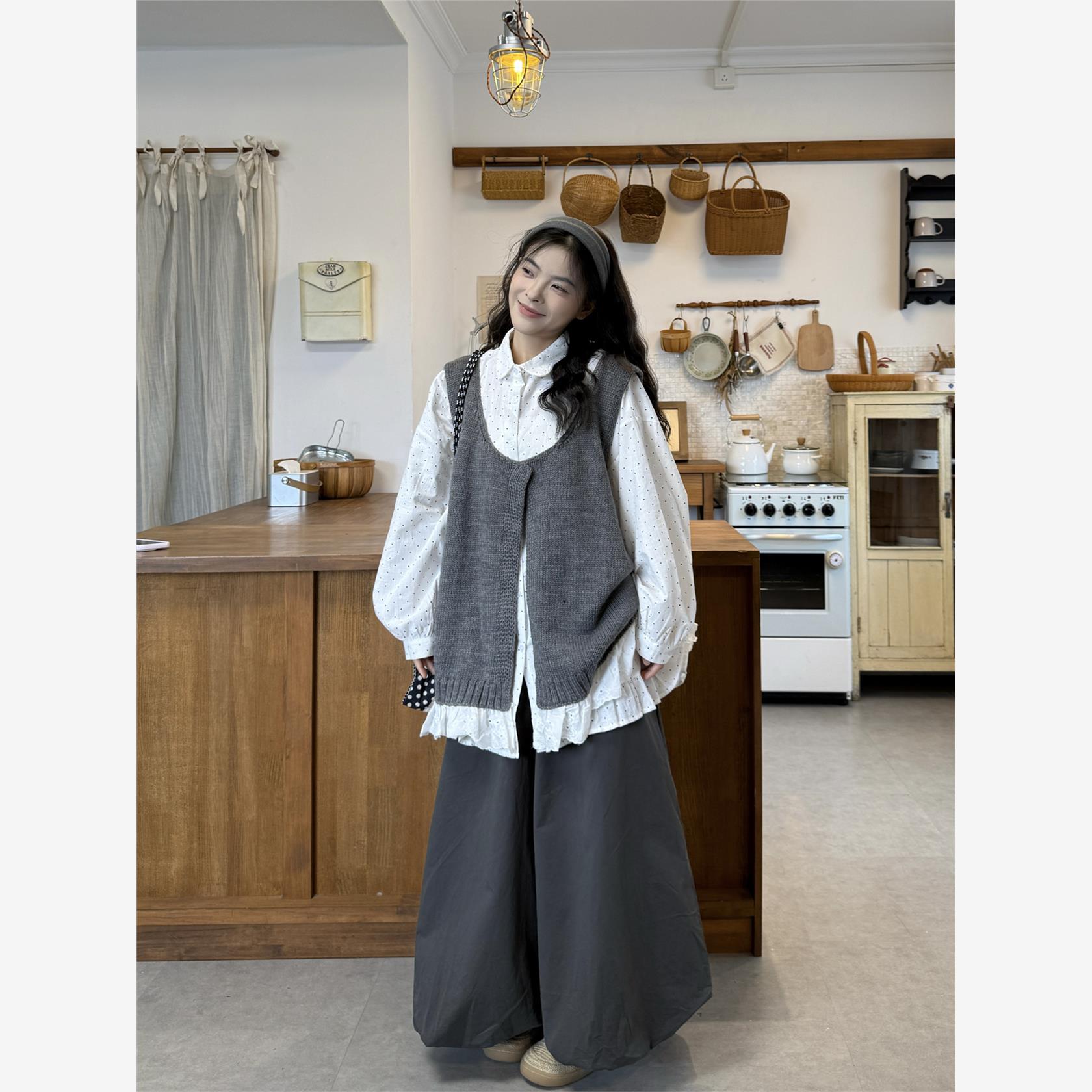 大码女装微胖mm覆古日系荷叶边拼接开衫叠穿宽松衬衫阔腿裤三件套