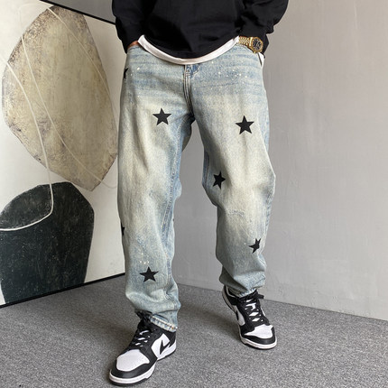 秋季美式休闲痞帅水洗复古个性印花牛仔裤男直筒宽松百搭锥形裤子