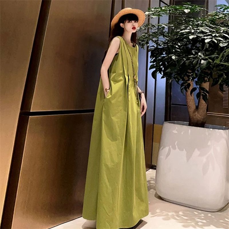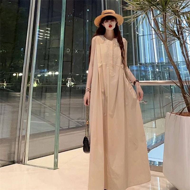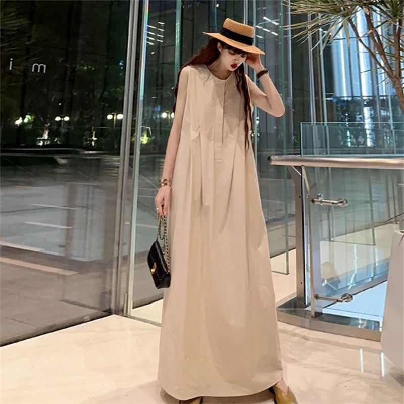 宽松大码长款连衣裙纯棉圆领套头气质学院风休闲百搭无袖打底长裙