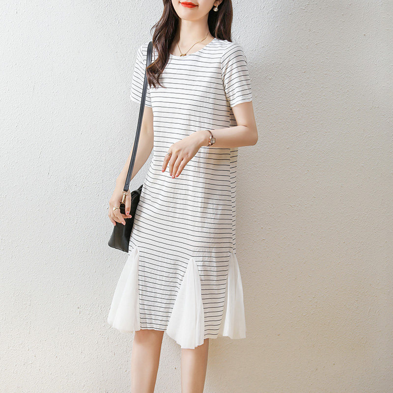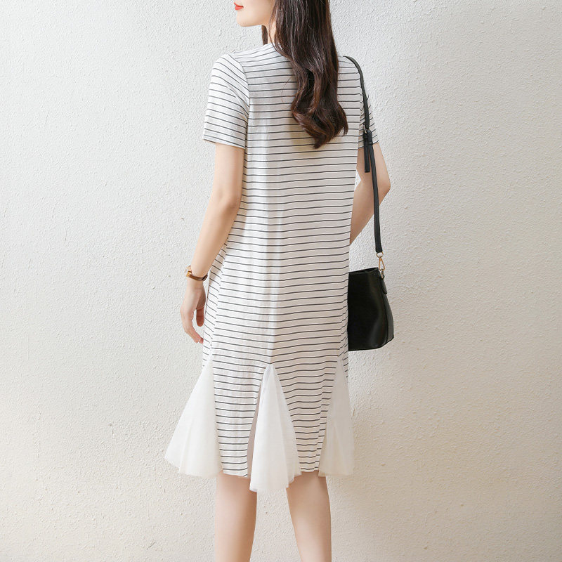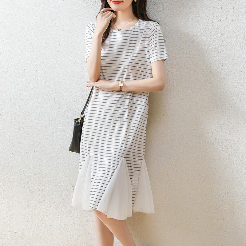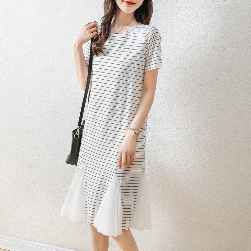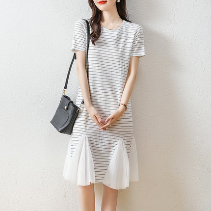 韩版直筒条纹雪纺拼接T恤裙