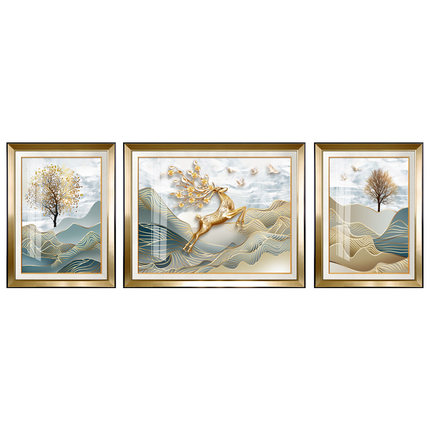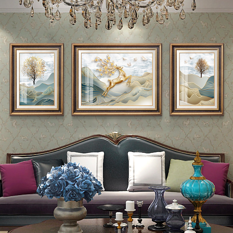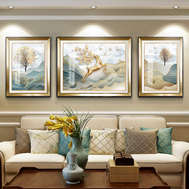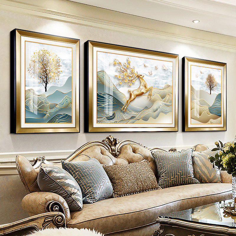 现代欧式客厅装饰画轻奢三联沙发背景墙大气福鹿高升挂画简欧墙画