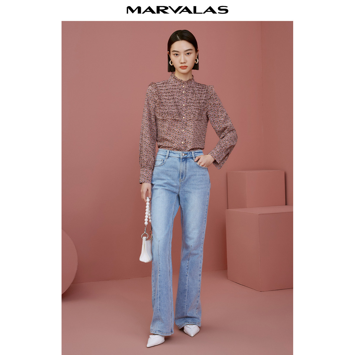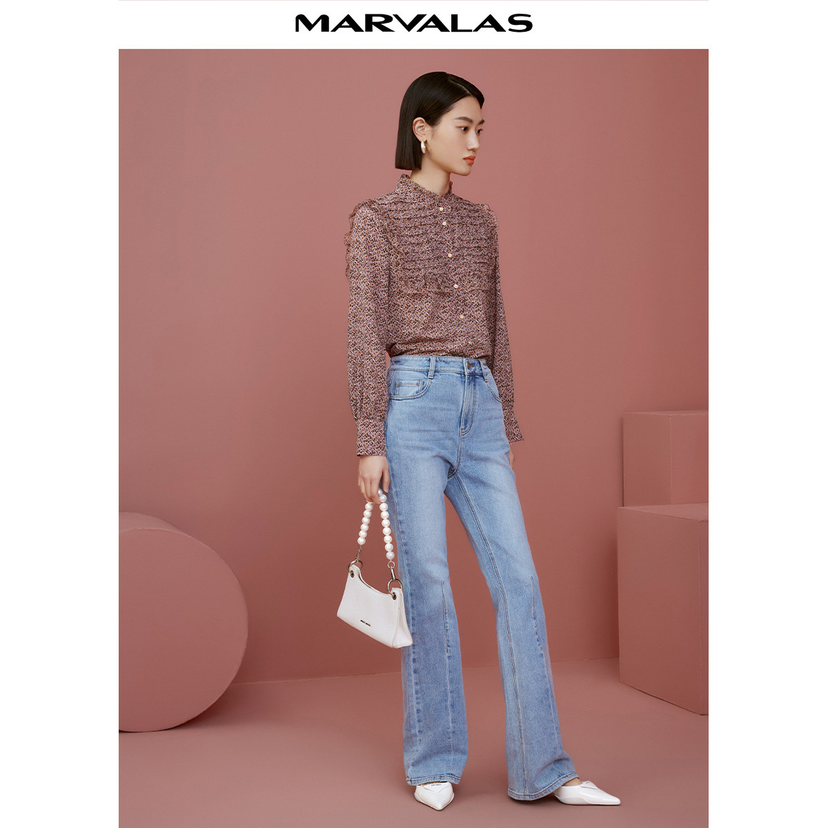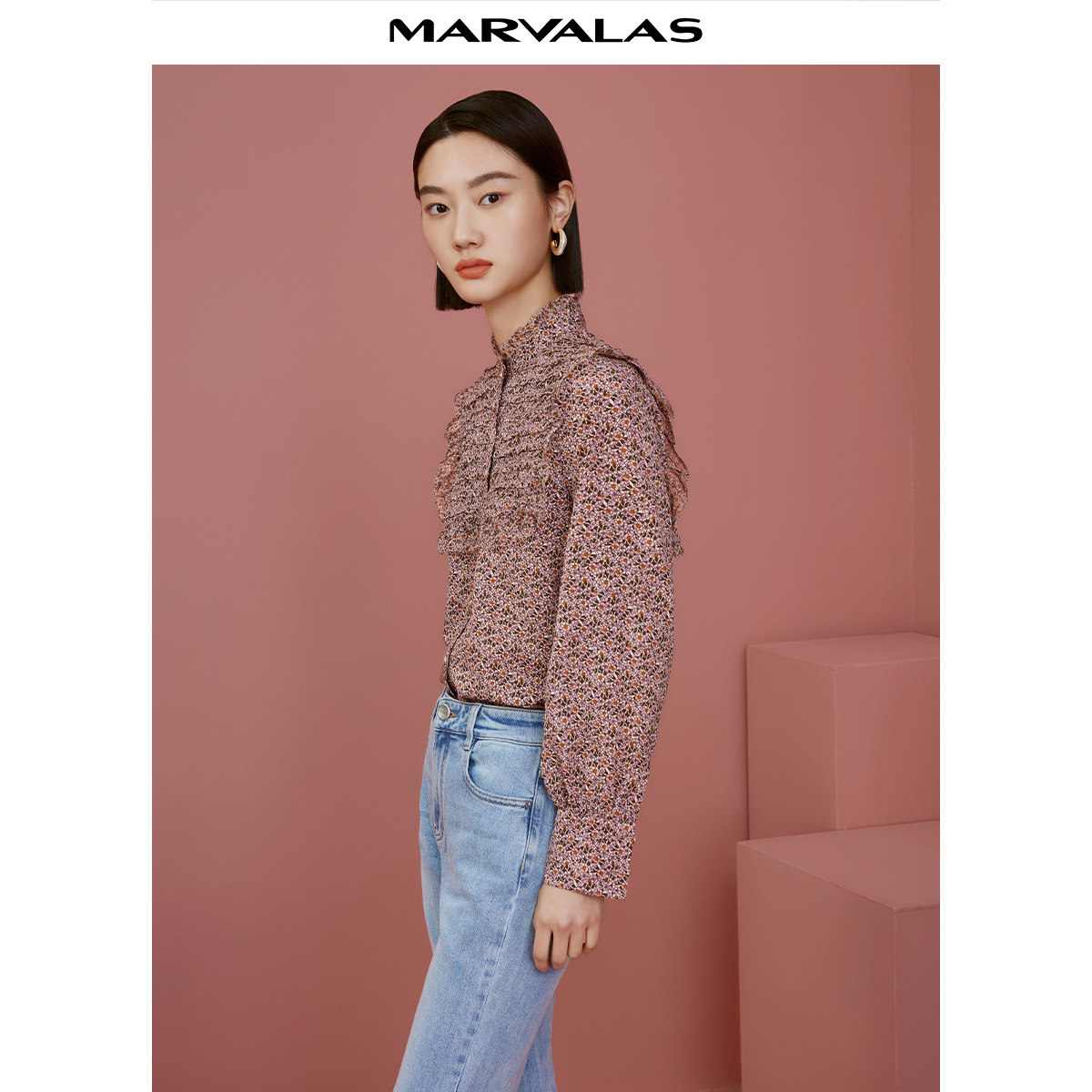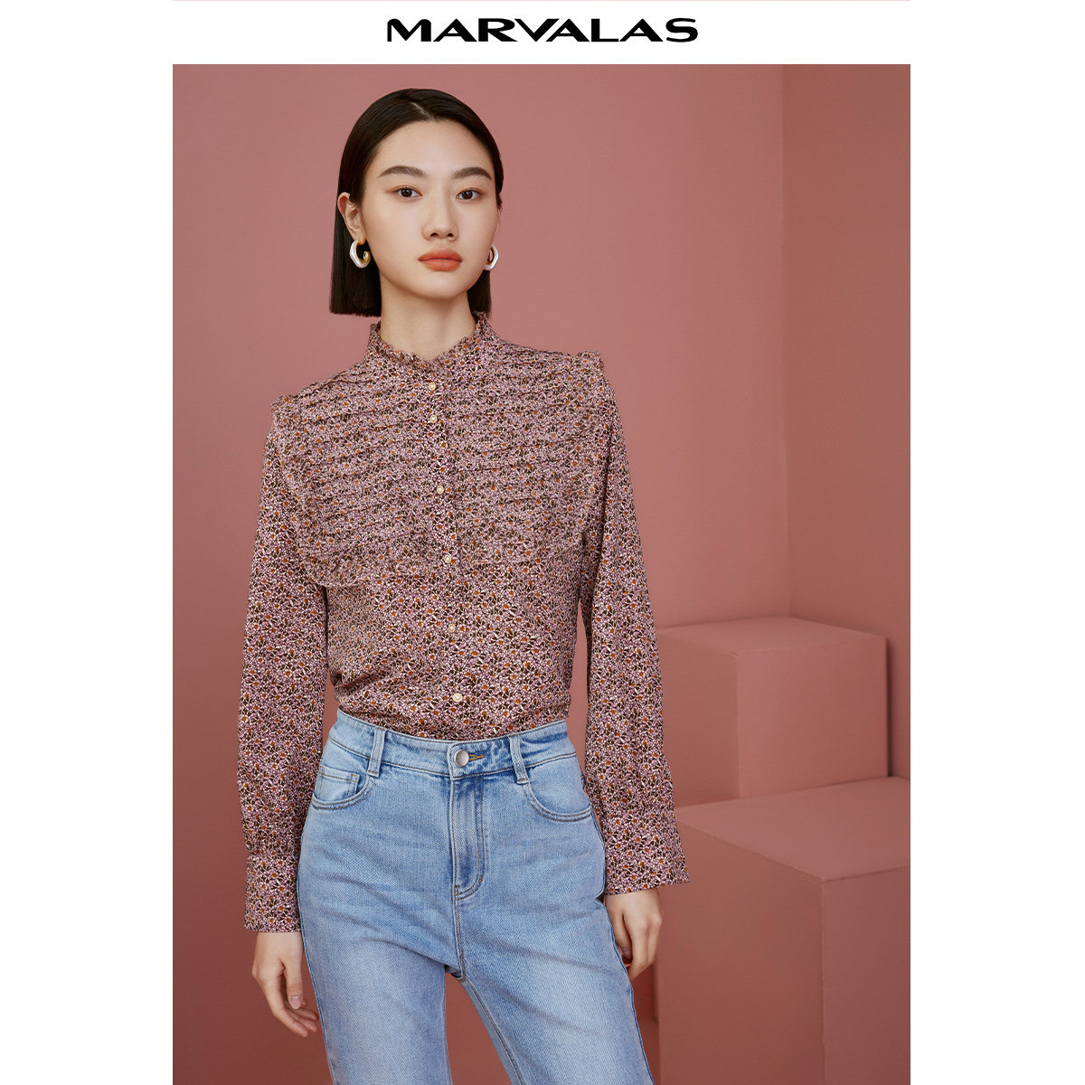曼德诗木耳边衬衫女2025秋季新款立领碎花雪纺衫时尚优雅长袖上衣