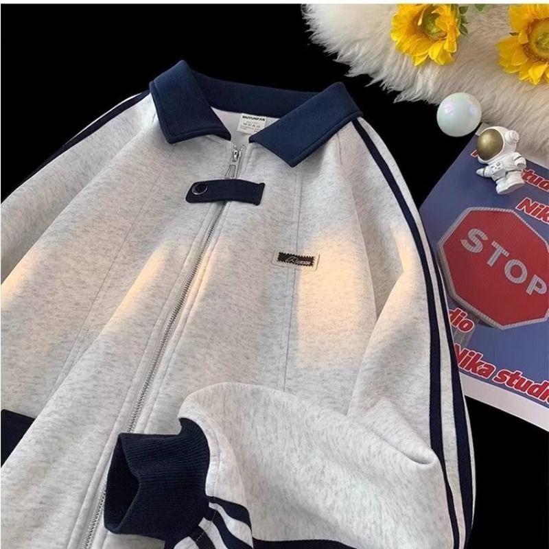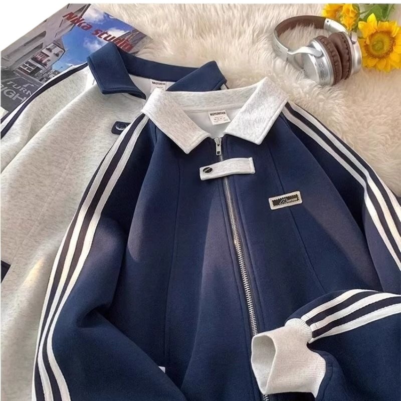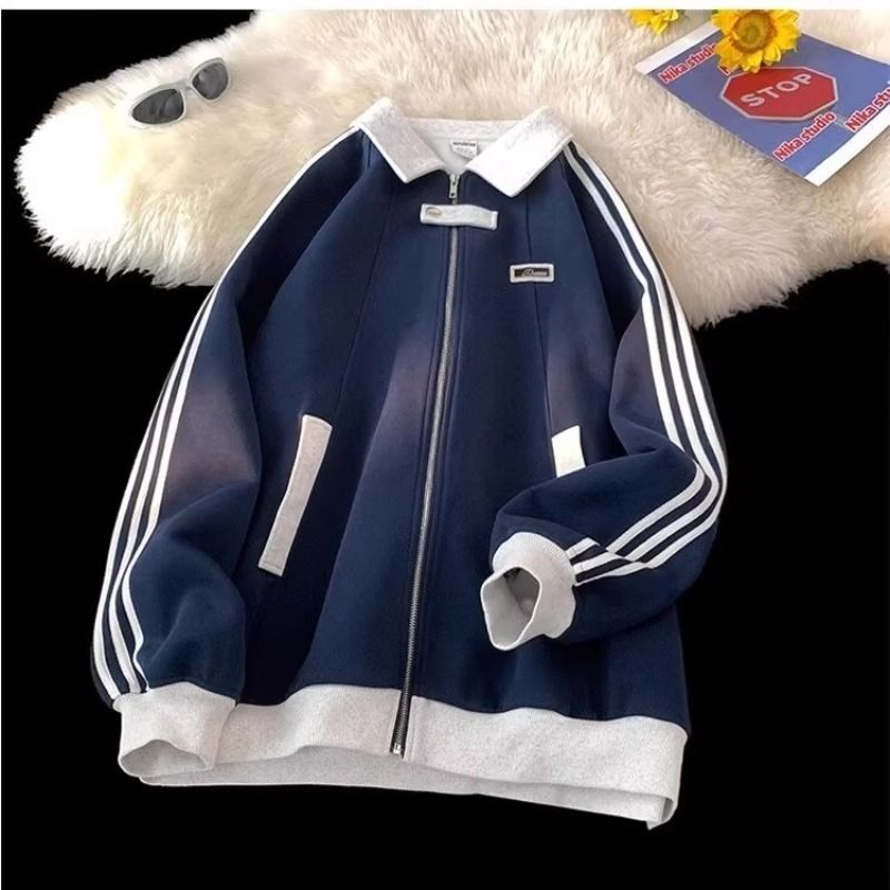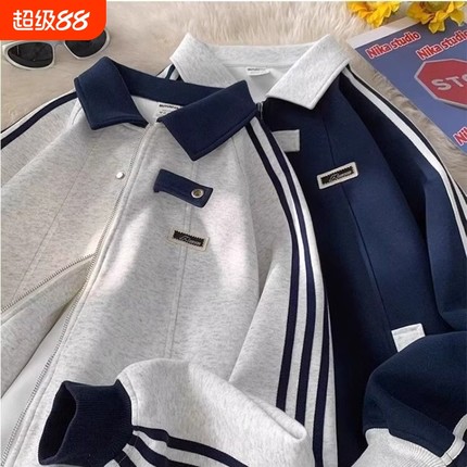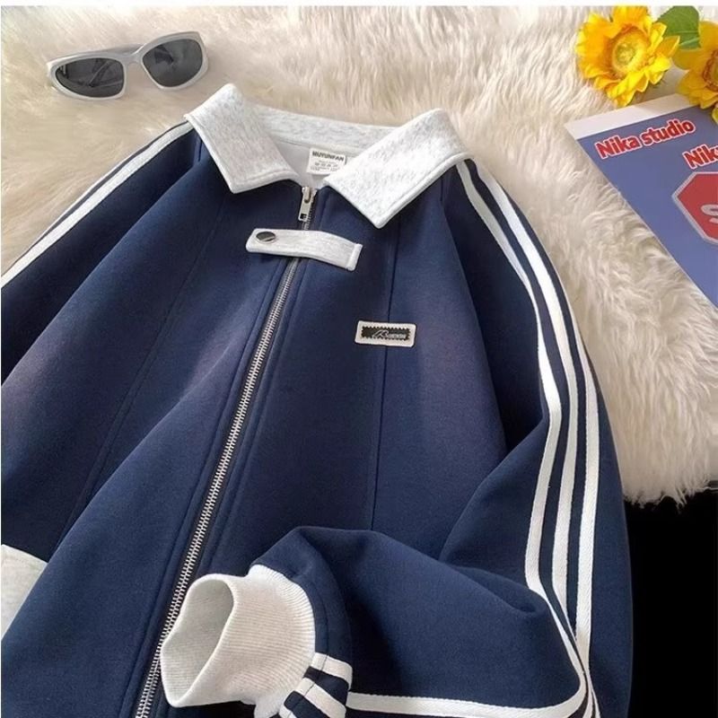 美式学院风外套男女复古三条杠撞色翻领重磅学生运动卫衣藏青色