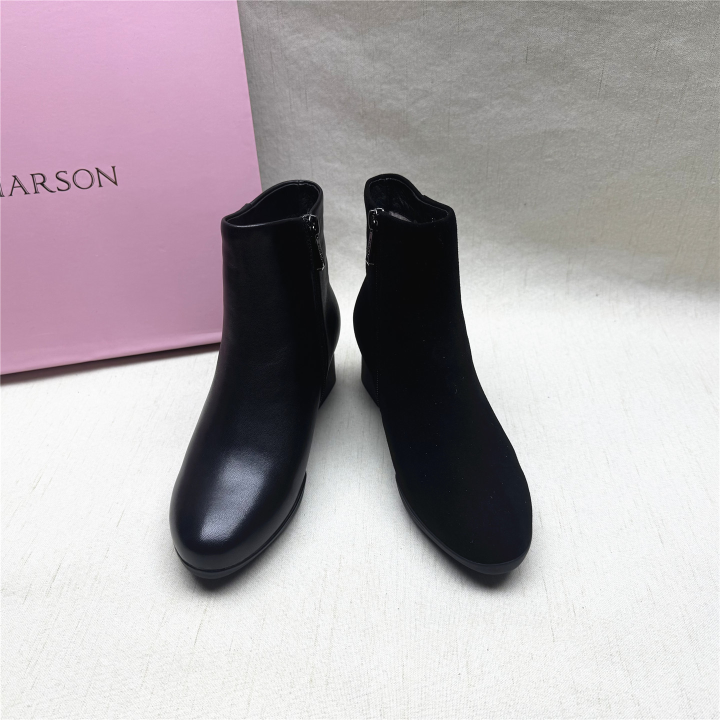 Harson/哈森正品撤柜粗跟圆头时装靴女冬季新款真皮羊毛保暖短靴