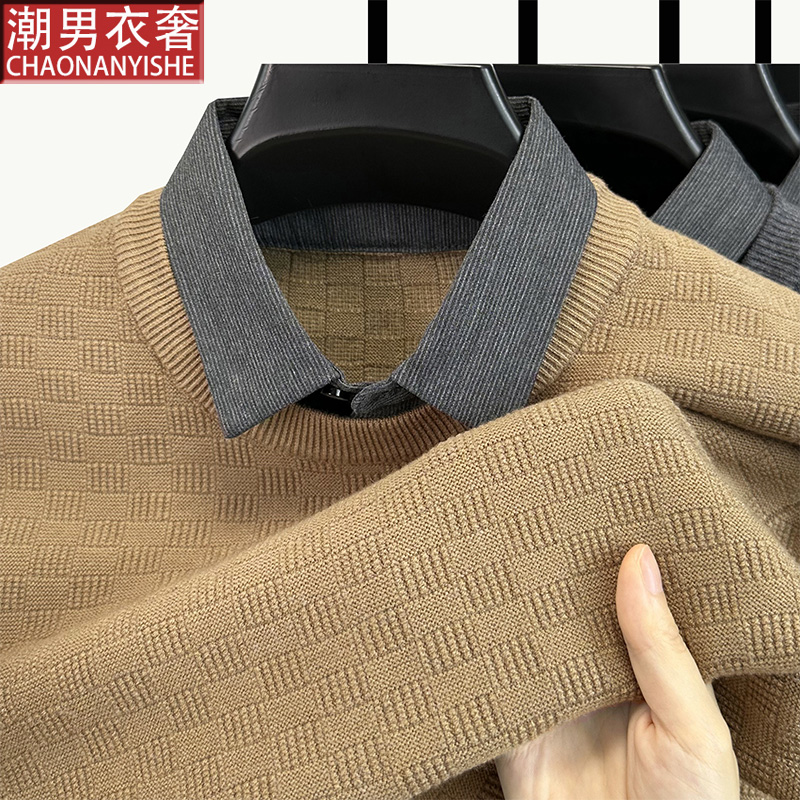 秋冬季新款羊毛衫男士衬衫领假两件毛衣男保暖打底衫提花针织衫潮