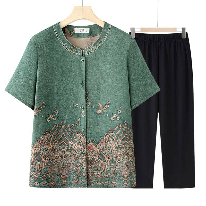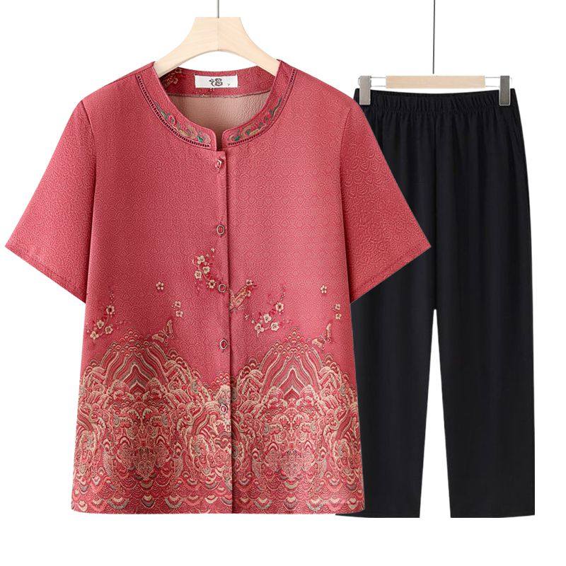 奶奶夏装短袖新款洋气中老年人女衬衫夏季短袖套装妈妈上衣宽松薄