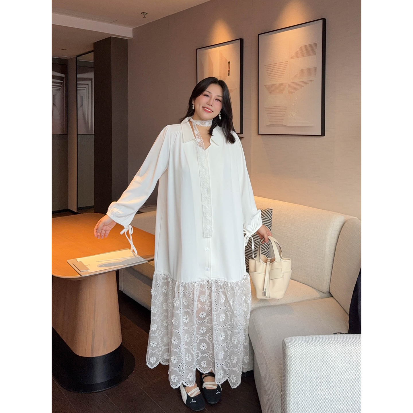 VOGANA戛纳家大码女装时髦优雅镂空蕾丝拼接连衣裙秋宽松显瘦长裙