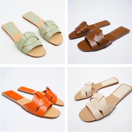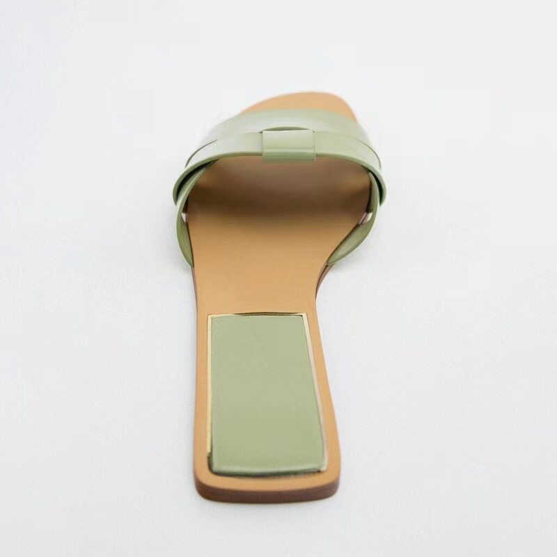 西班牙2025夏季新品 一字带交叉鞋后空绿色拖外穿牛皮革平底凉鞋