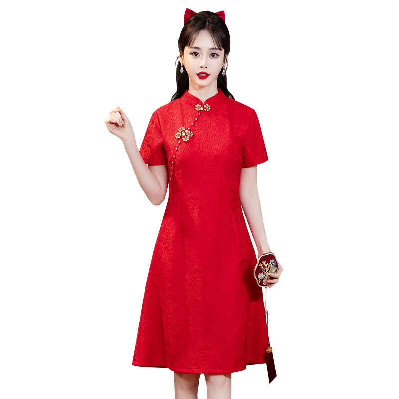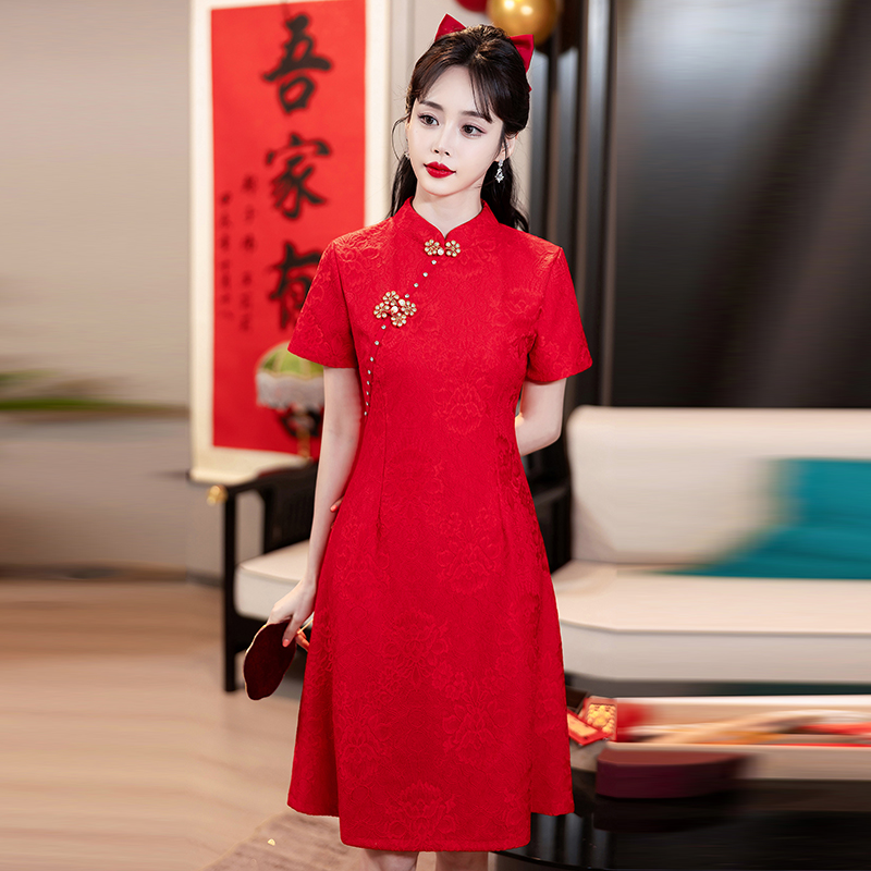 小个子新中式中国红改良旗袍连衣裙女夏季新娘敬酒服结婚礼服裙子