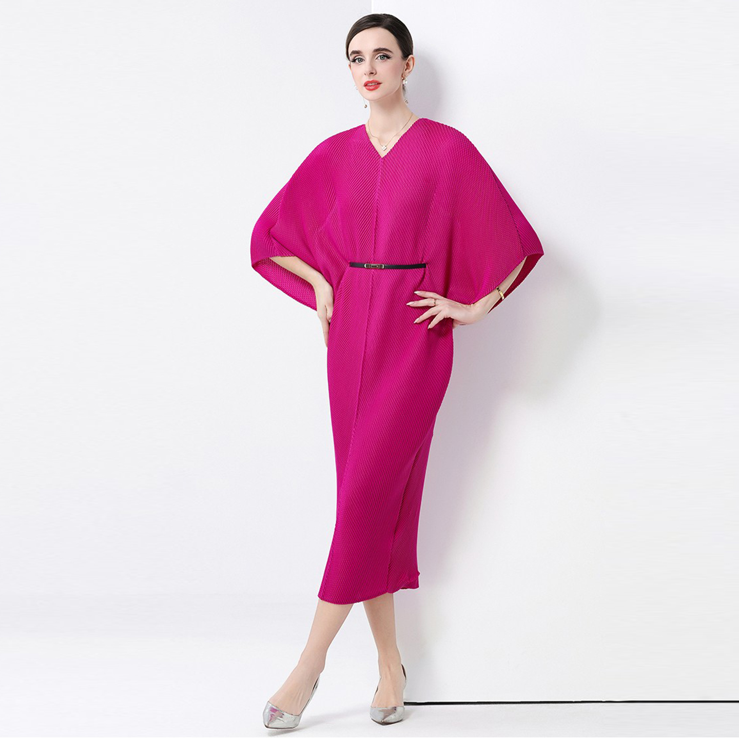 新款春秋季欧美时尚通勤气质大码蝙蝠袖褶皱工艺连衣裙女中长款
