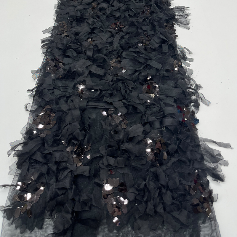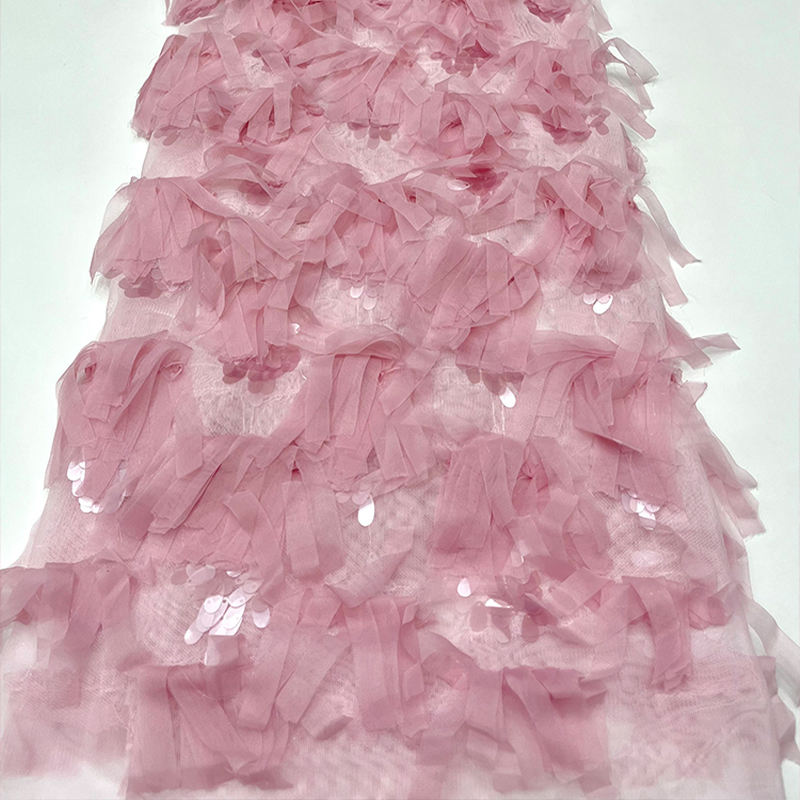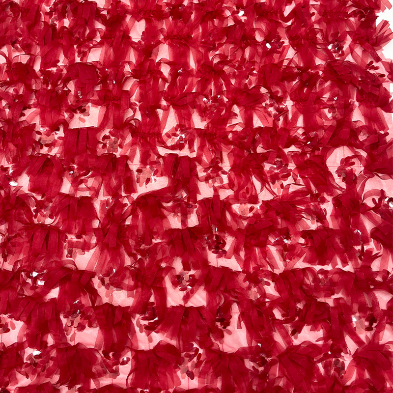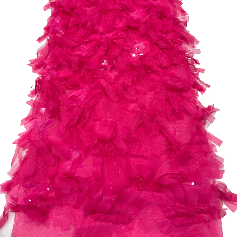 新款红色蕾丝网纱布料雪坊流苏乱纹型珠片亮片刺绣面料礼服连衣裙