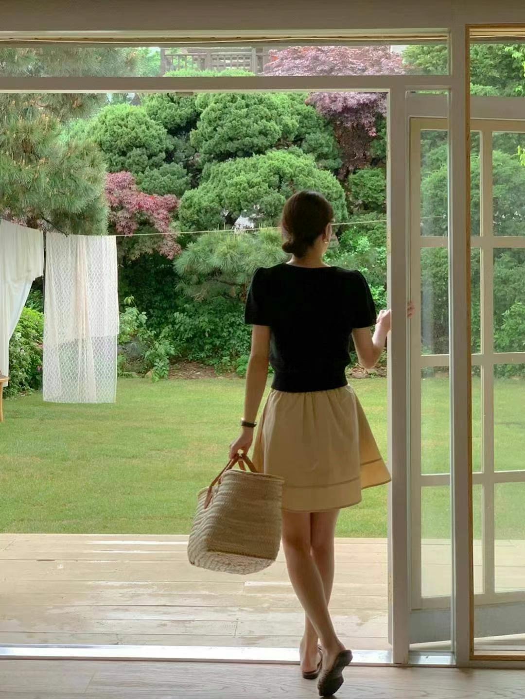 韩国代购东大门代购Areing 新款米色松紧腰百褶半身裙