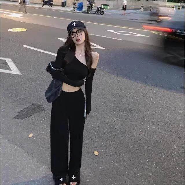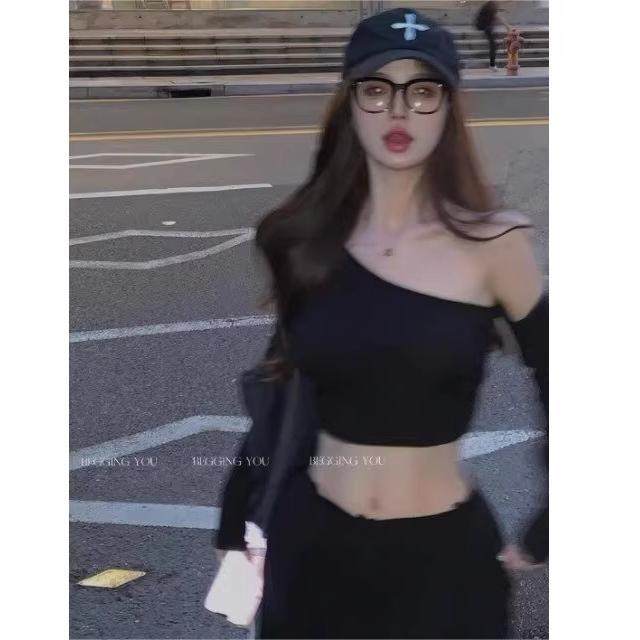 辣妹性感一字肩长袖T恤女漏肚脐腰背春夏小众露肩斜肩短款上衣棉