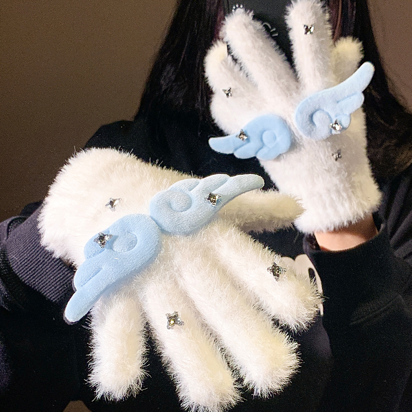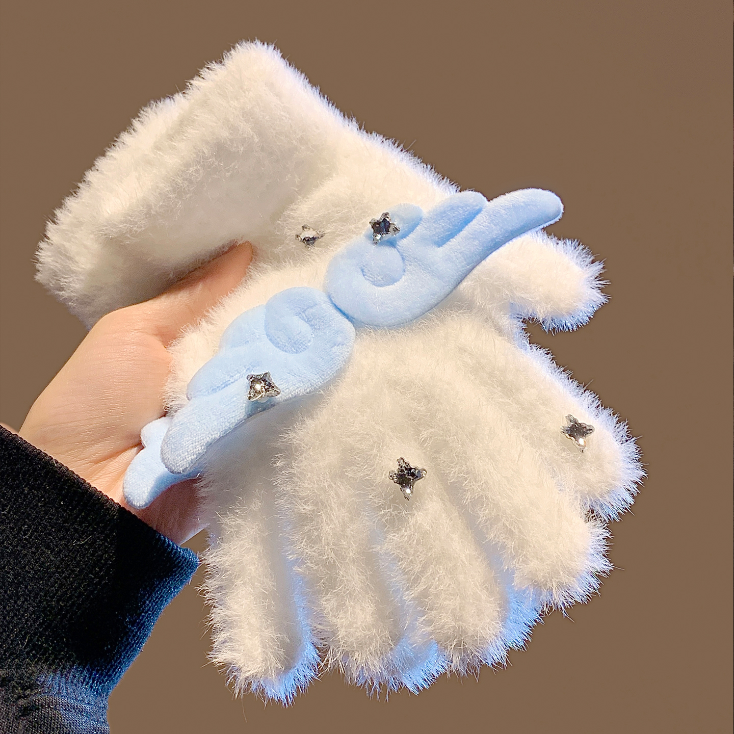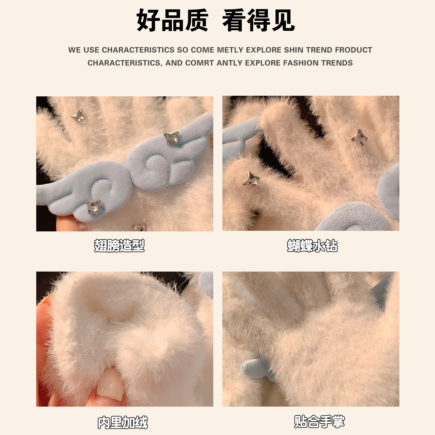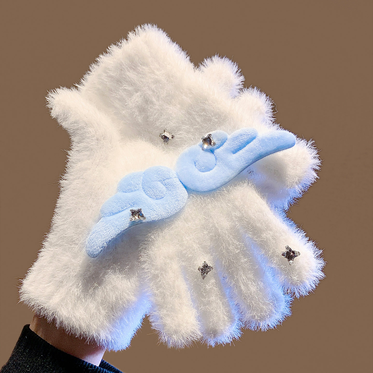 可爱闪钻天使小翅膀毛绒针织分指手套女冬季保暖御寒学生骑行防风
