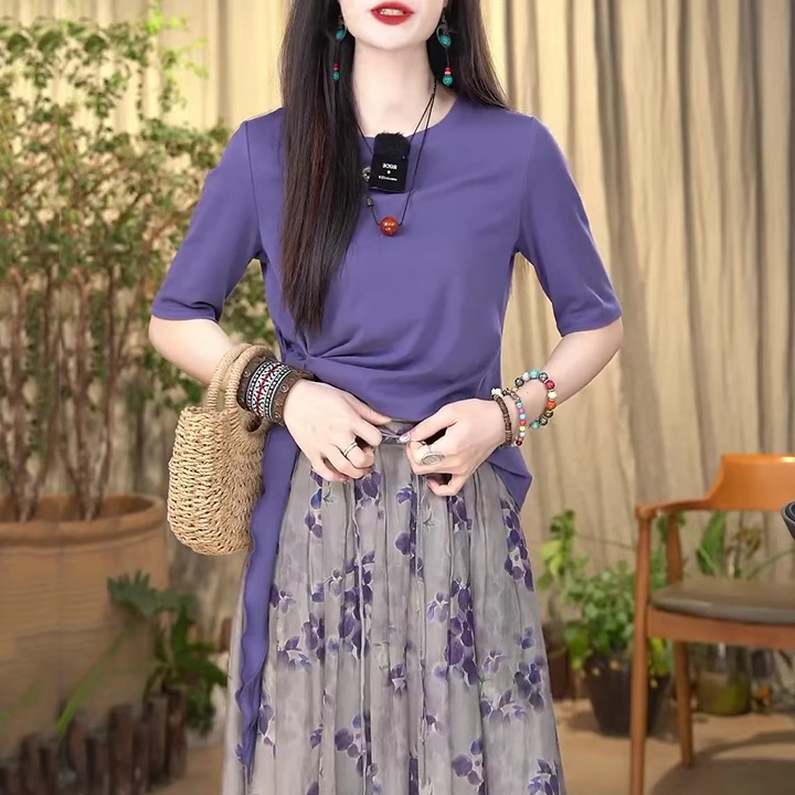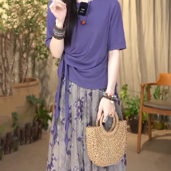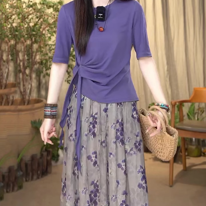 复古气质时尚洋气休闲套装女夏季减龄短袖T恤薰衣草半身裙两件套