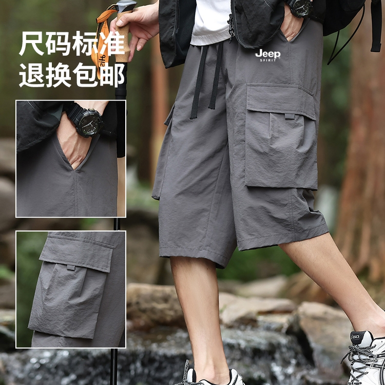 吉普JEEP直筒宽松冰丝工装短裤男士夏季薄款中裤户外休闲七分裤子