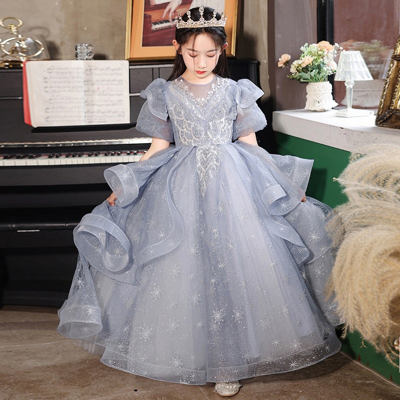 儿童钢琴演奏蓝色公主裙女童生日花童婚纱小女孩主持人高端晚礼服