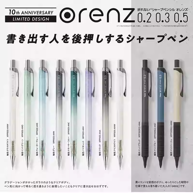 日本Pentel派通笔orenz10周年限定极细0.3透明杆0.5HB自动铅笔0.2