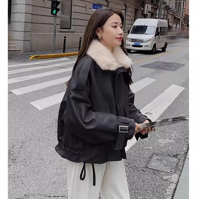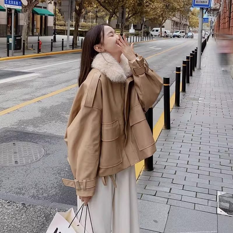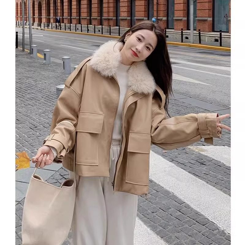 大毛领pu皮衣外套女冬季短款2023新款小个子加绒加厚皮夹克机车服