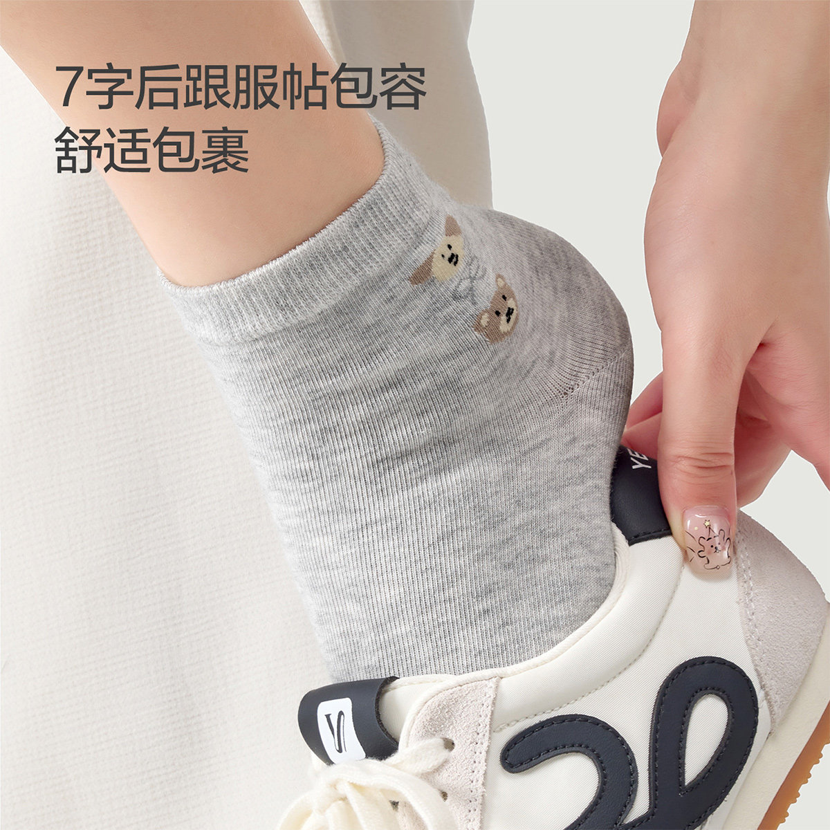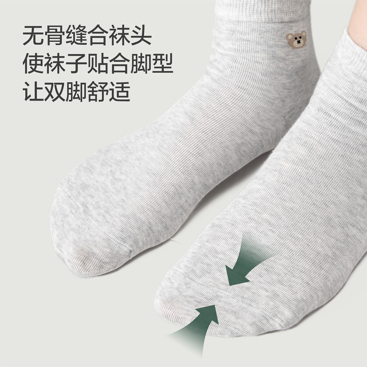意尔康7A抗菌女短袜透气休闲女袜卡通小熊无骨袜子白色女士短筒袜