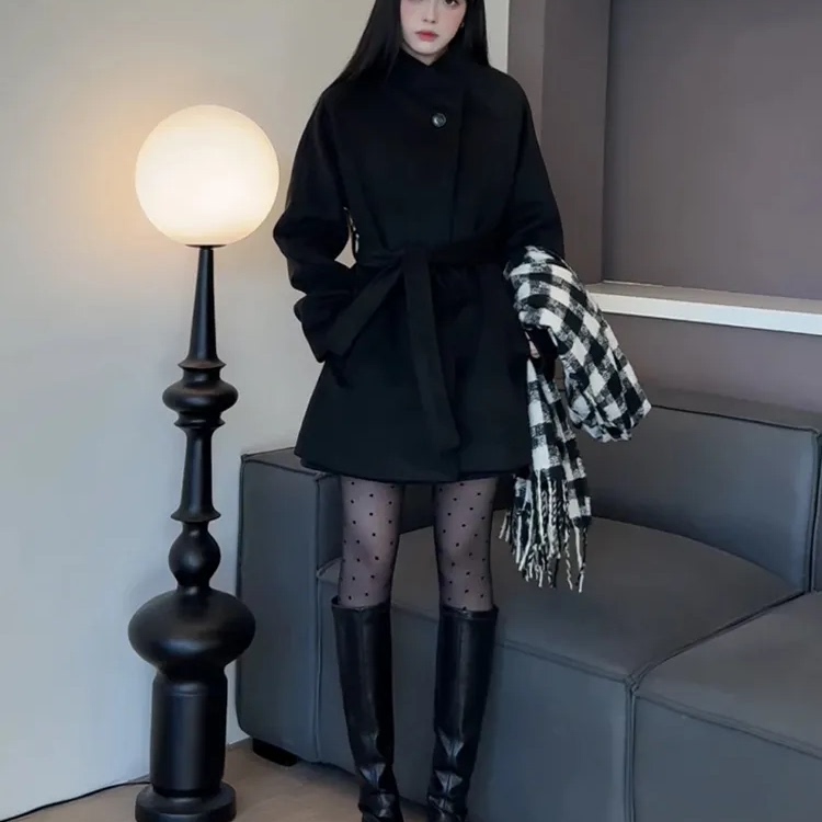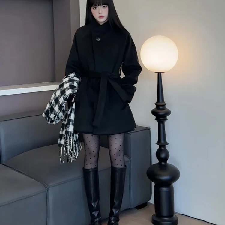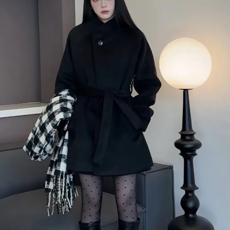 黑色系带中长款呢子大衣女2025新款秋冬高级感收腰小个子毛呢外套