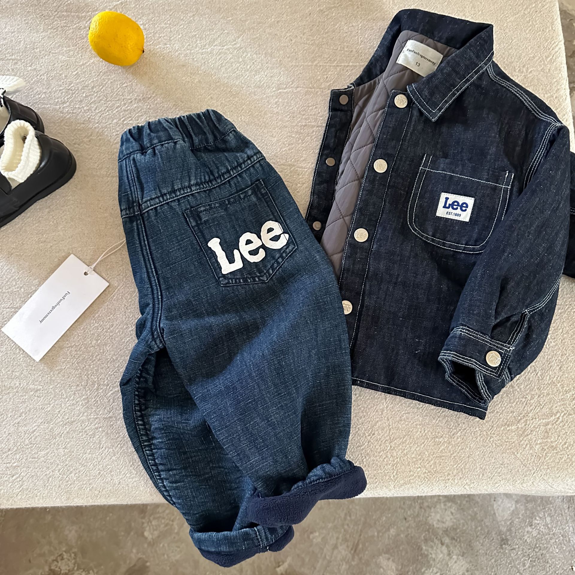 儿童加绒牛仔裤男女童加厚休闲长裤2025冬新款宝宝字母直筒裤潮牌