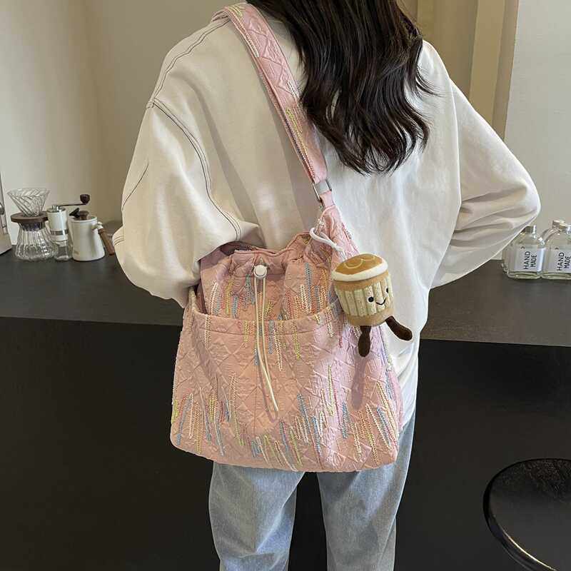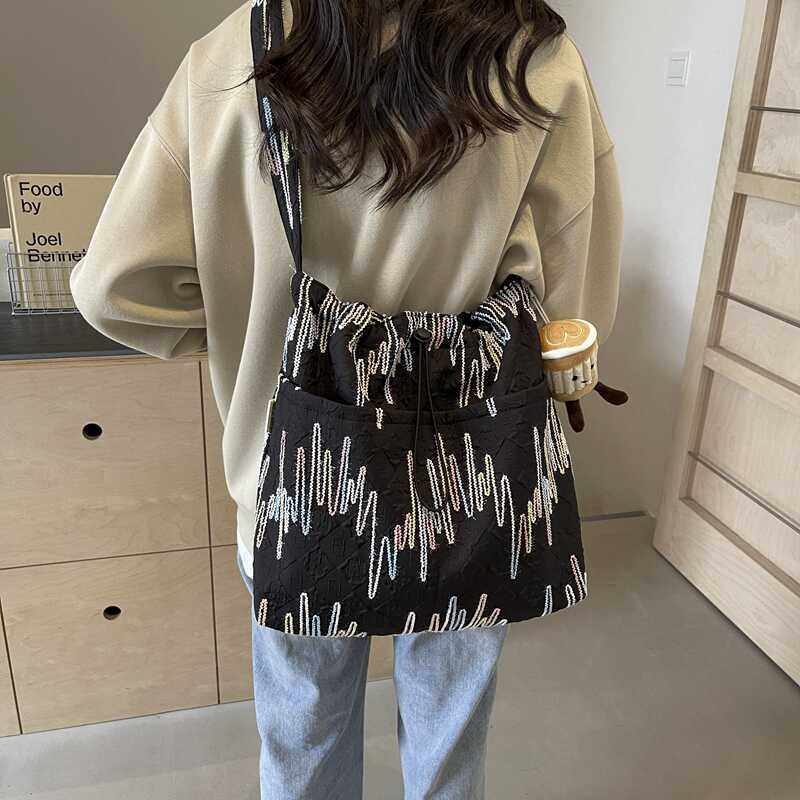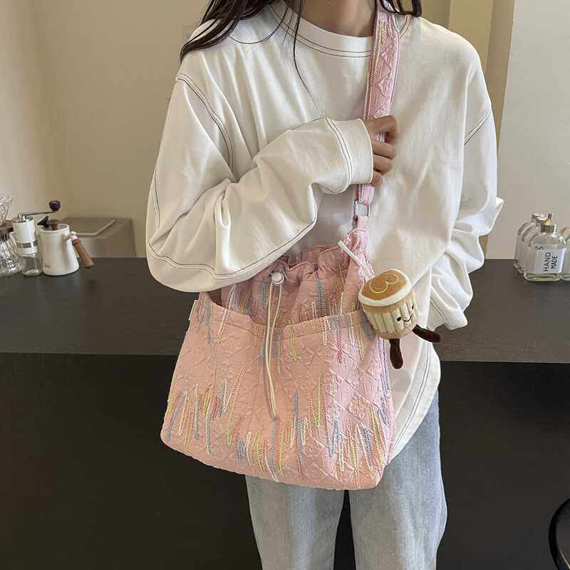 2025新款轻便简约抽绳彩线托特包小清新单肩时尚斜挎ins帆布女包