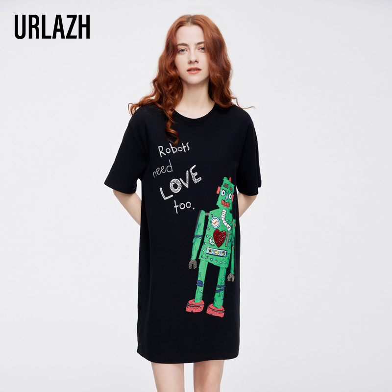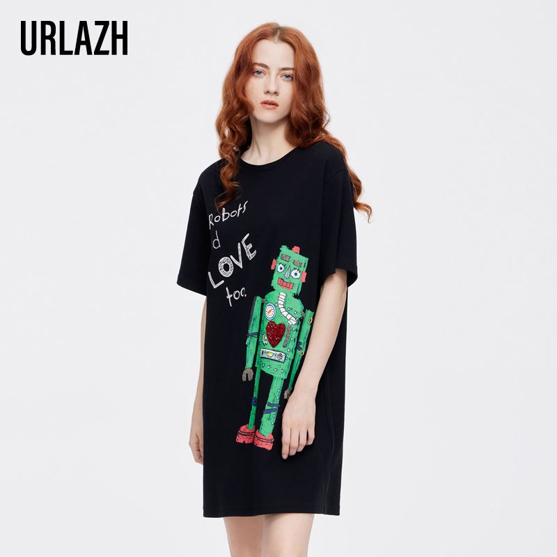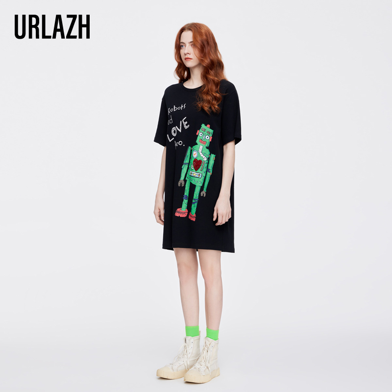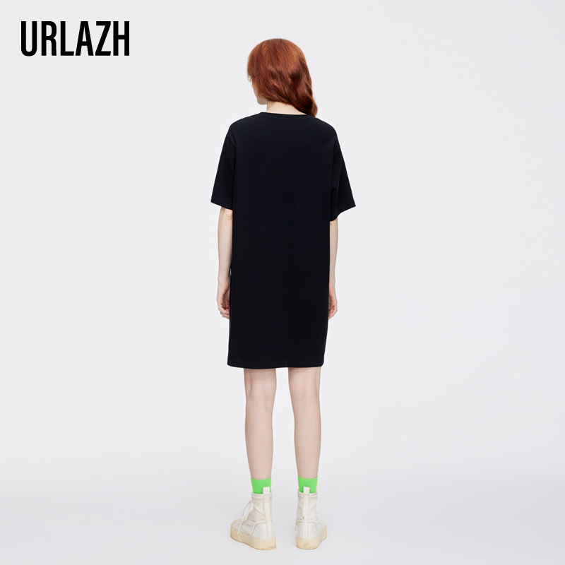 URLAZH有兰新款复古气质黑色印花宽松休闲短袖连衣裙女
