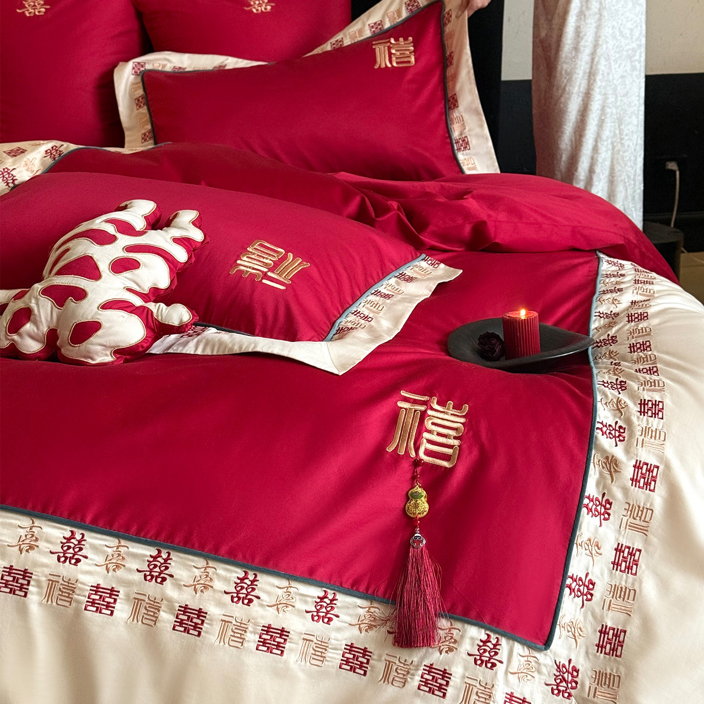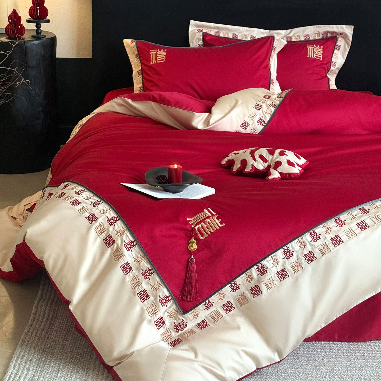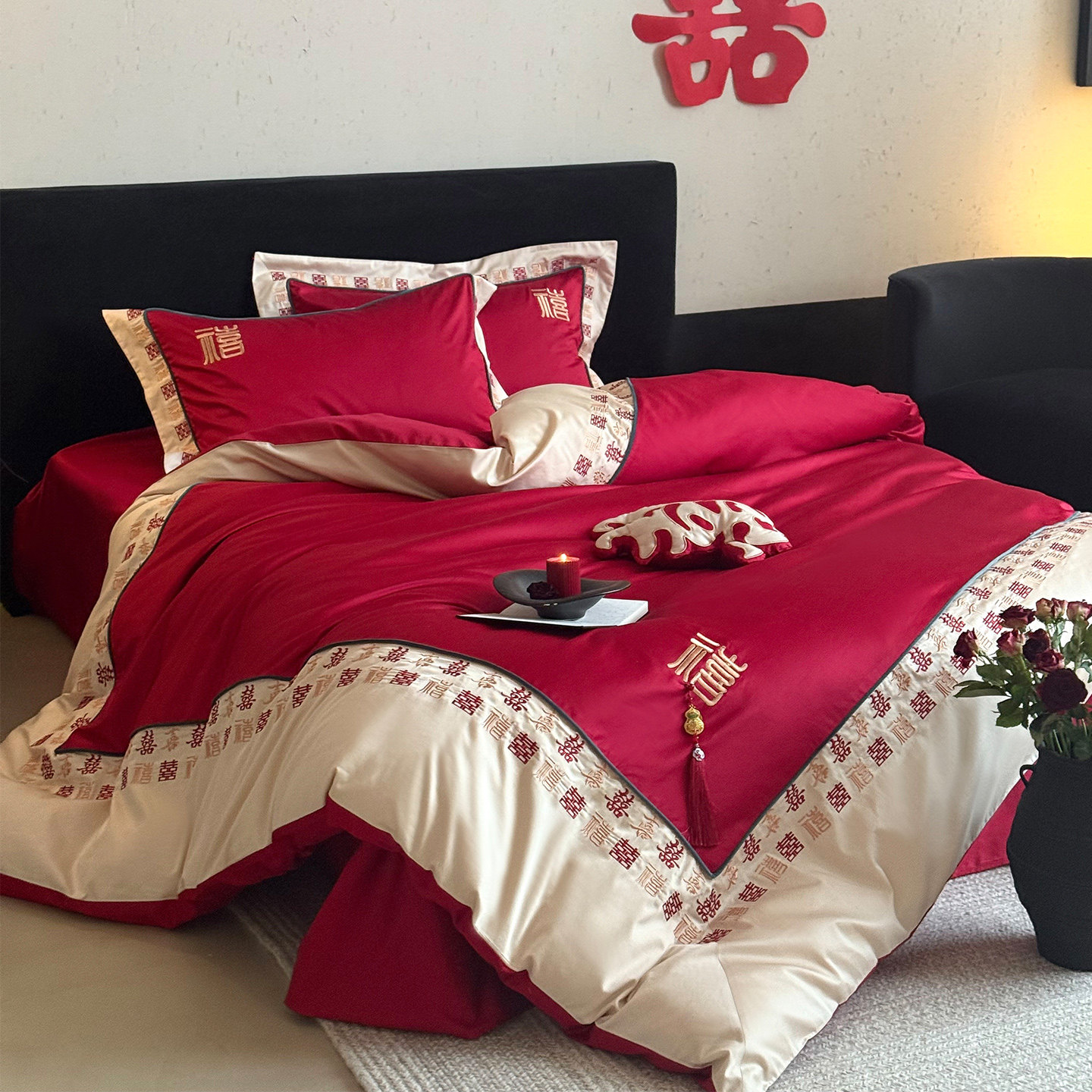 LANSWAY迎喜中式婚庆四件套全棉百喜字刺绣结婚红色被套床单床笠