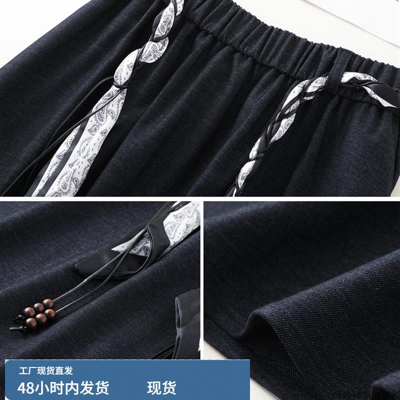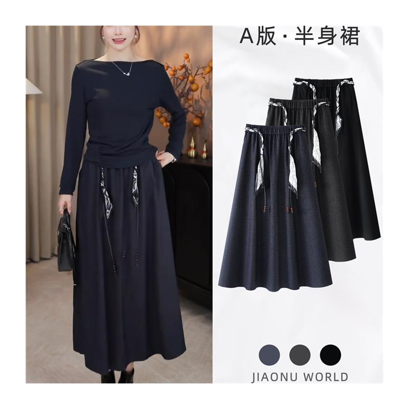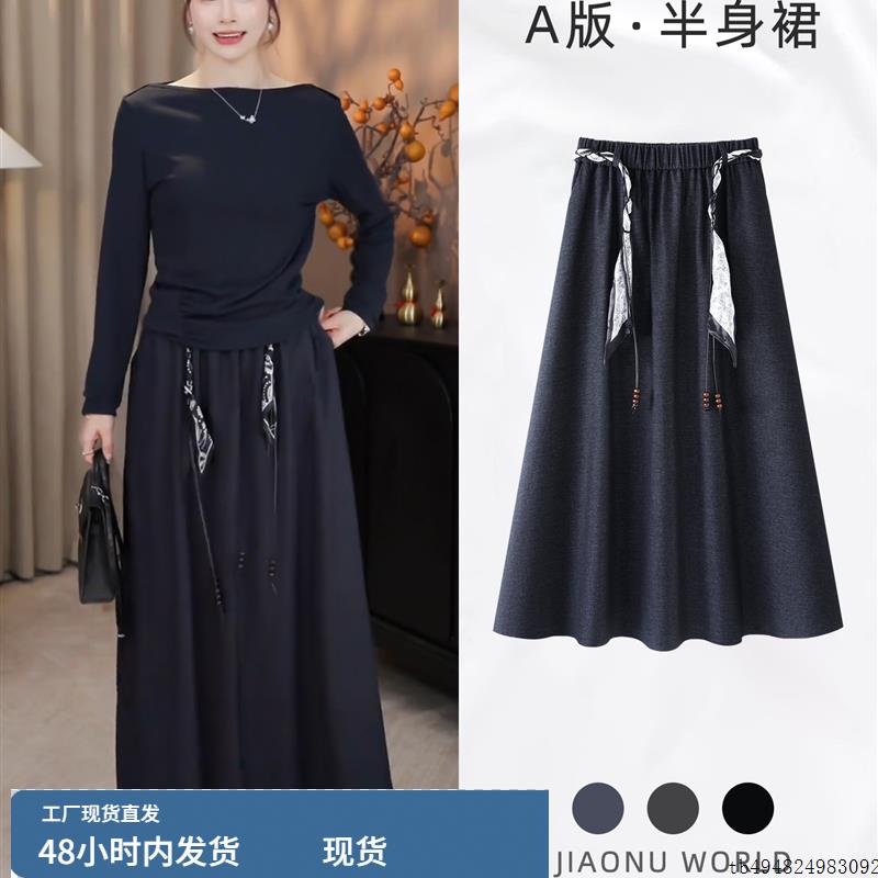 开叉黑色丝巾腰带半身休闲裙女秋季2025新款高腰a字中长直筒半裙