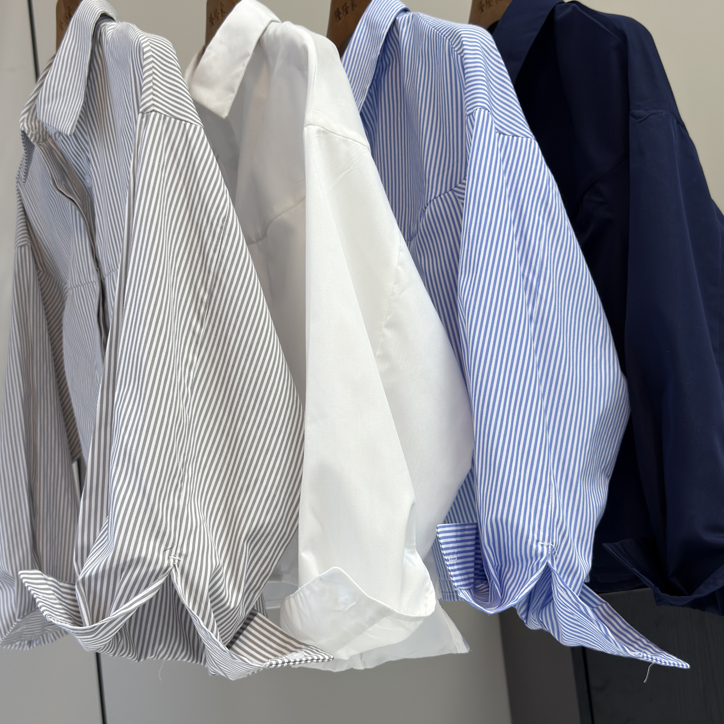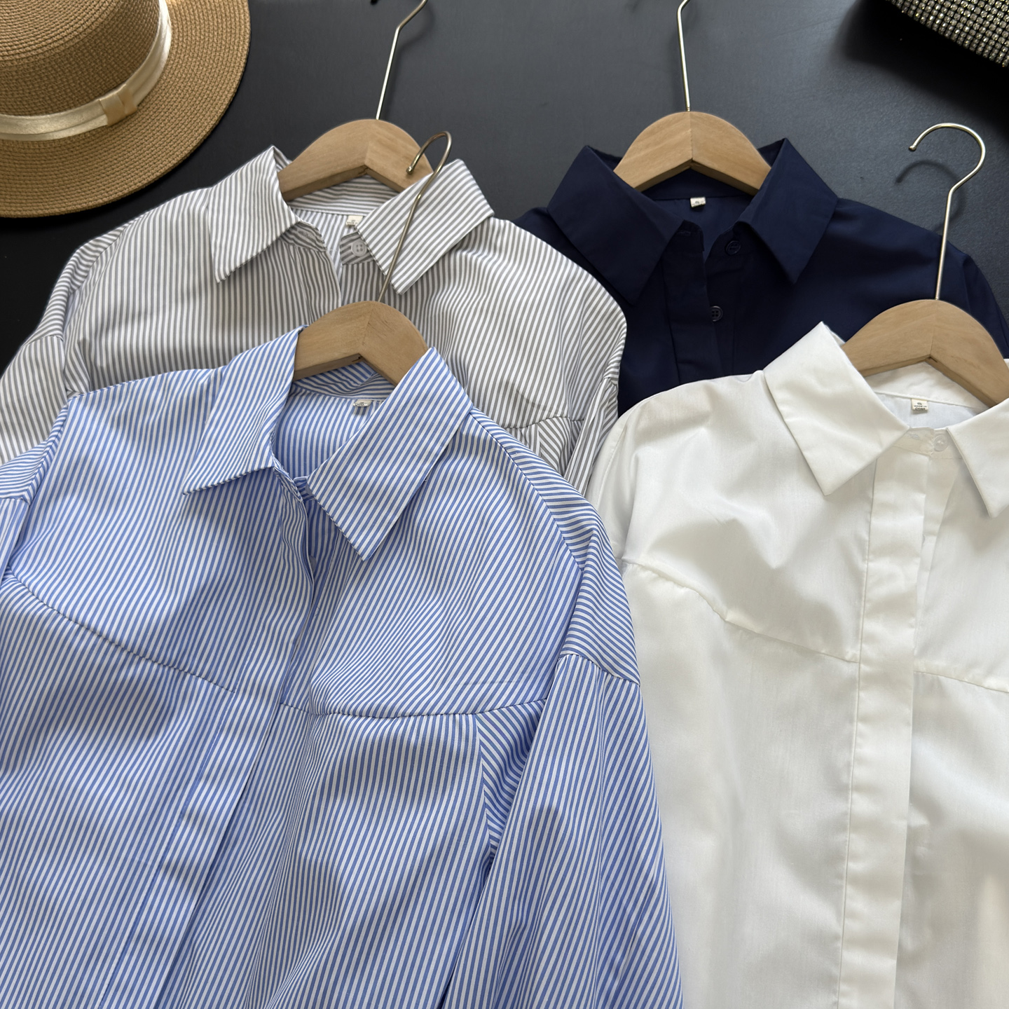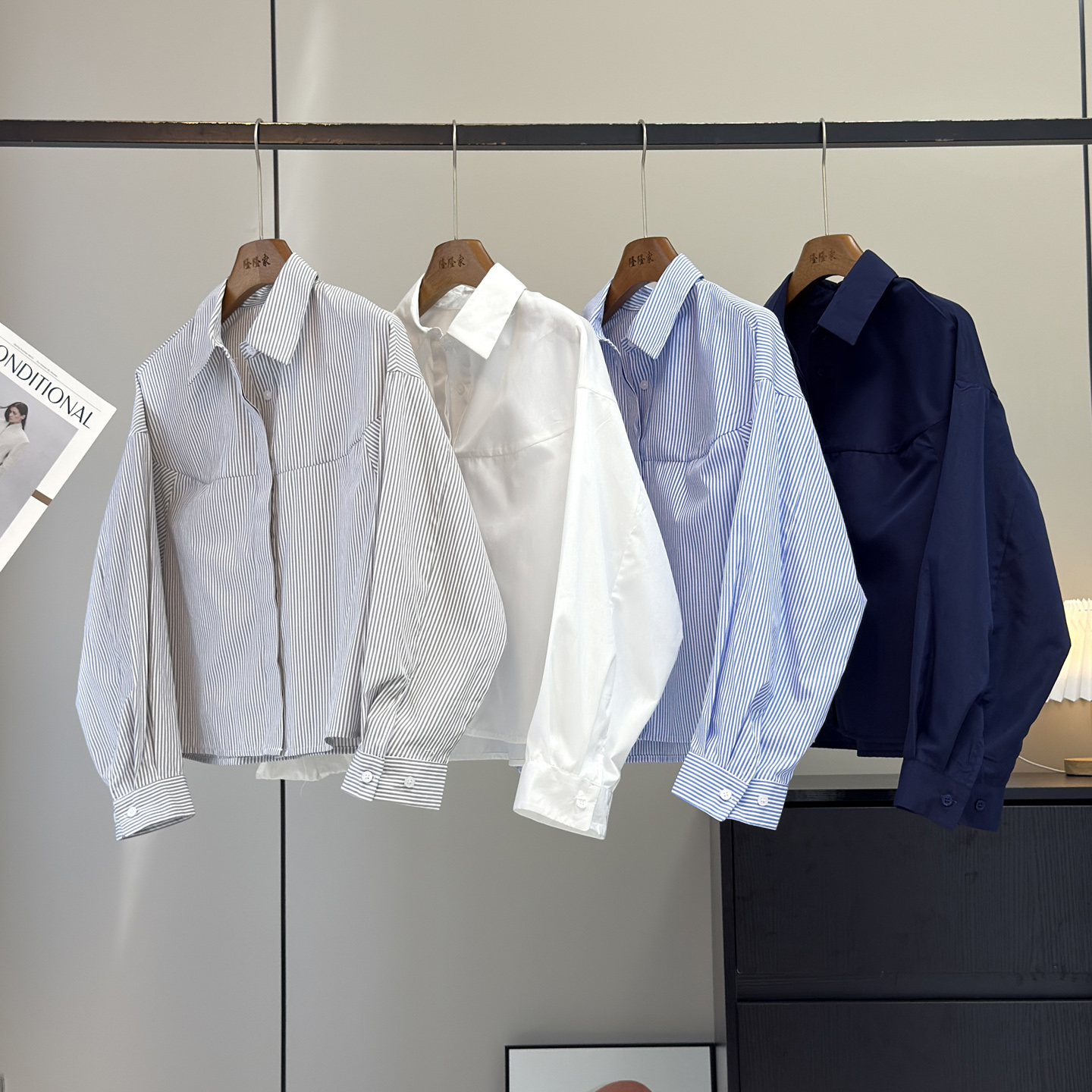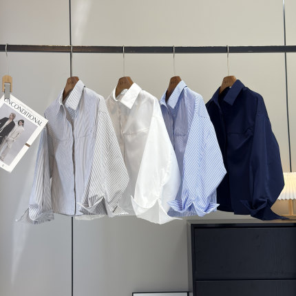 大厂订单!秋季新品简约舒适棉混纺翻领条纹长袖短款衬衫宽松上衣
