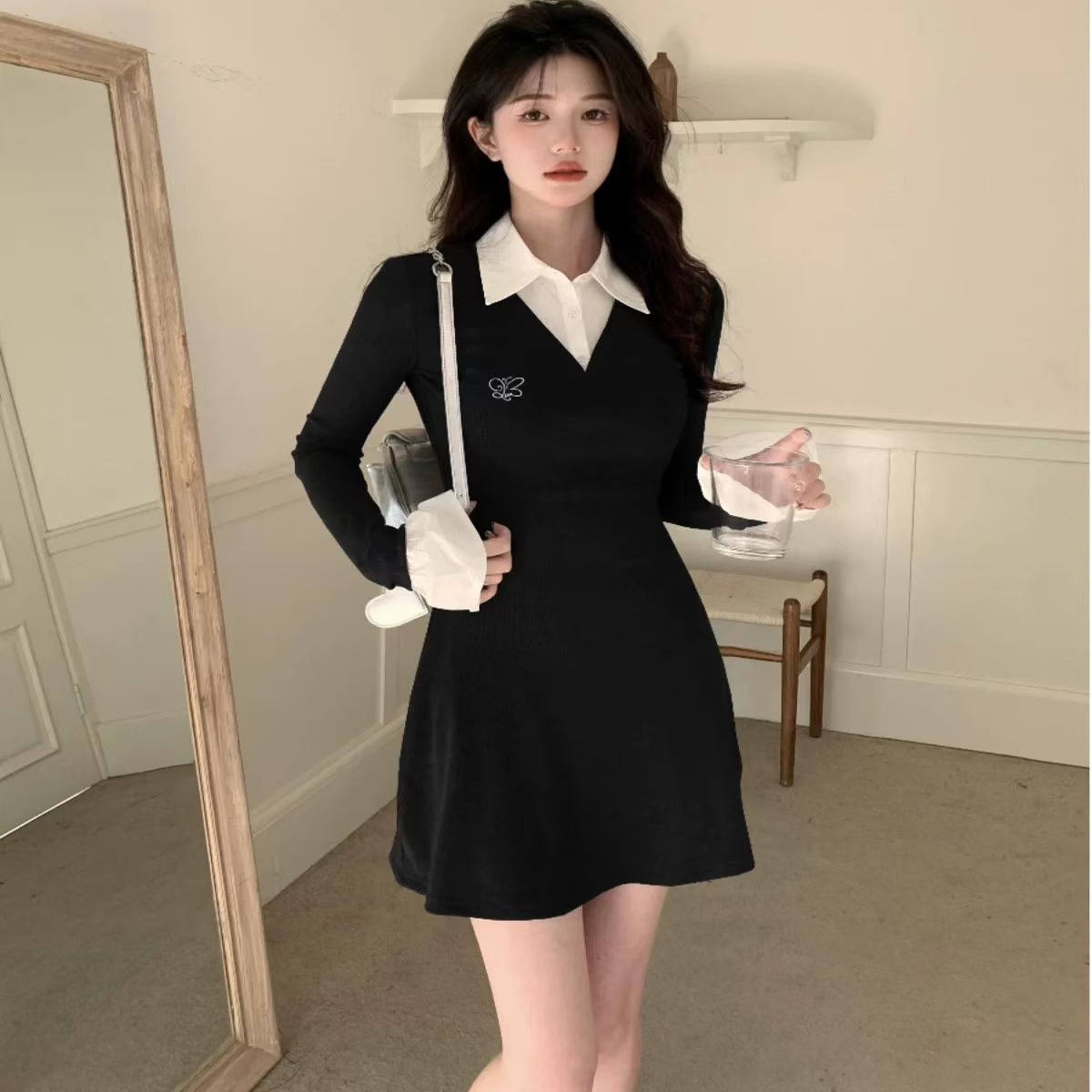 大码胖mm学院风撞色polo领衬衫连衣裙女春秋辣妹修身收腰包臀短裙