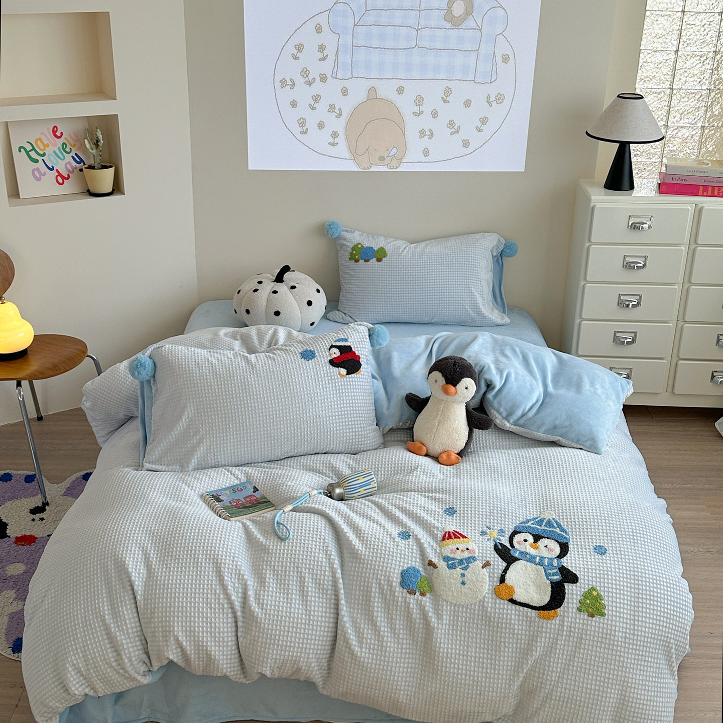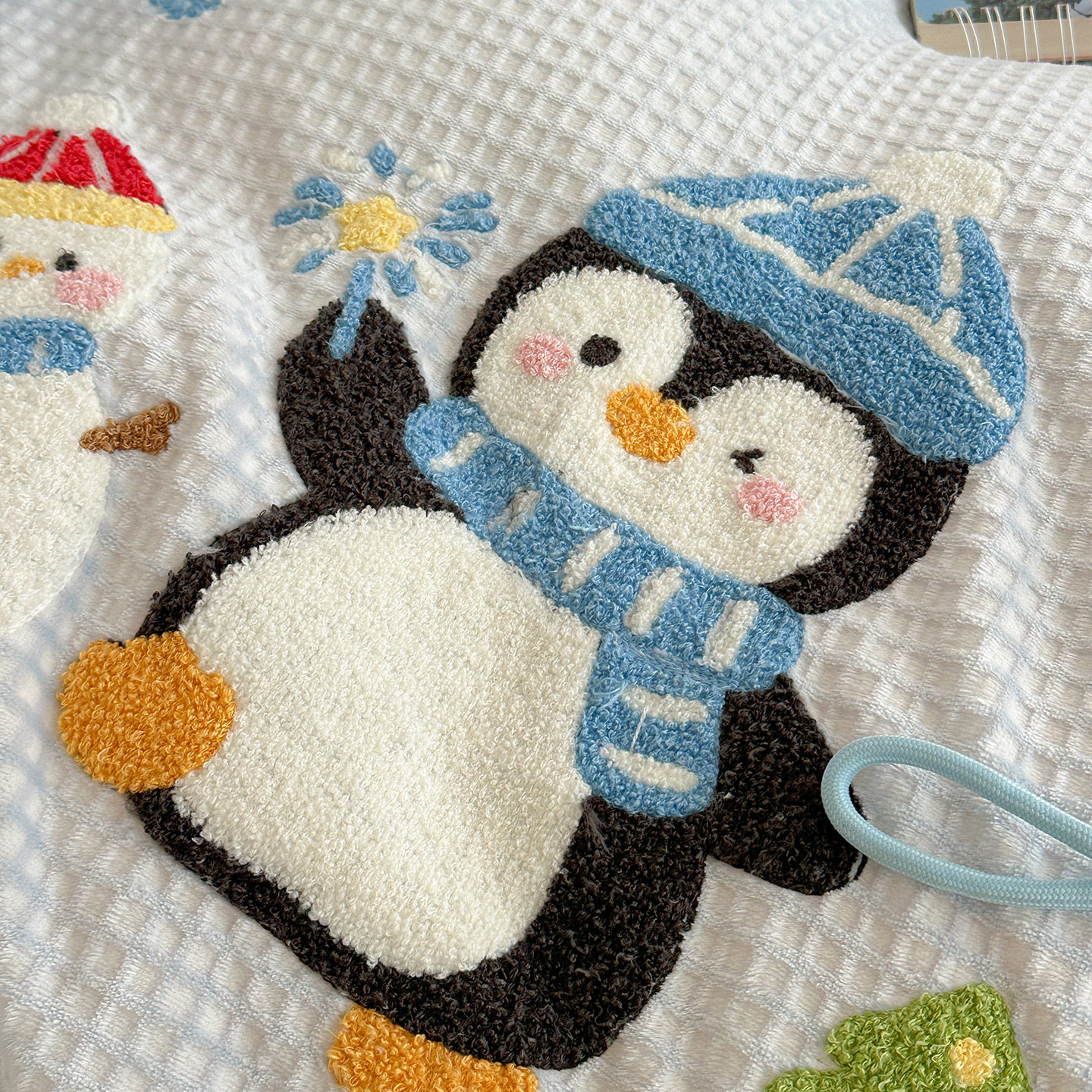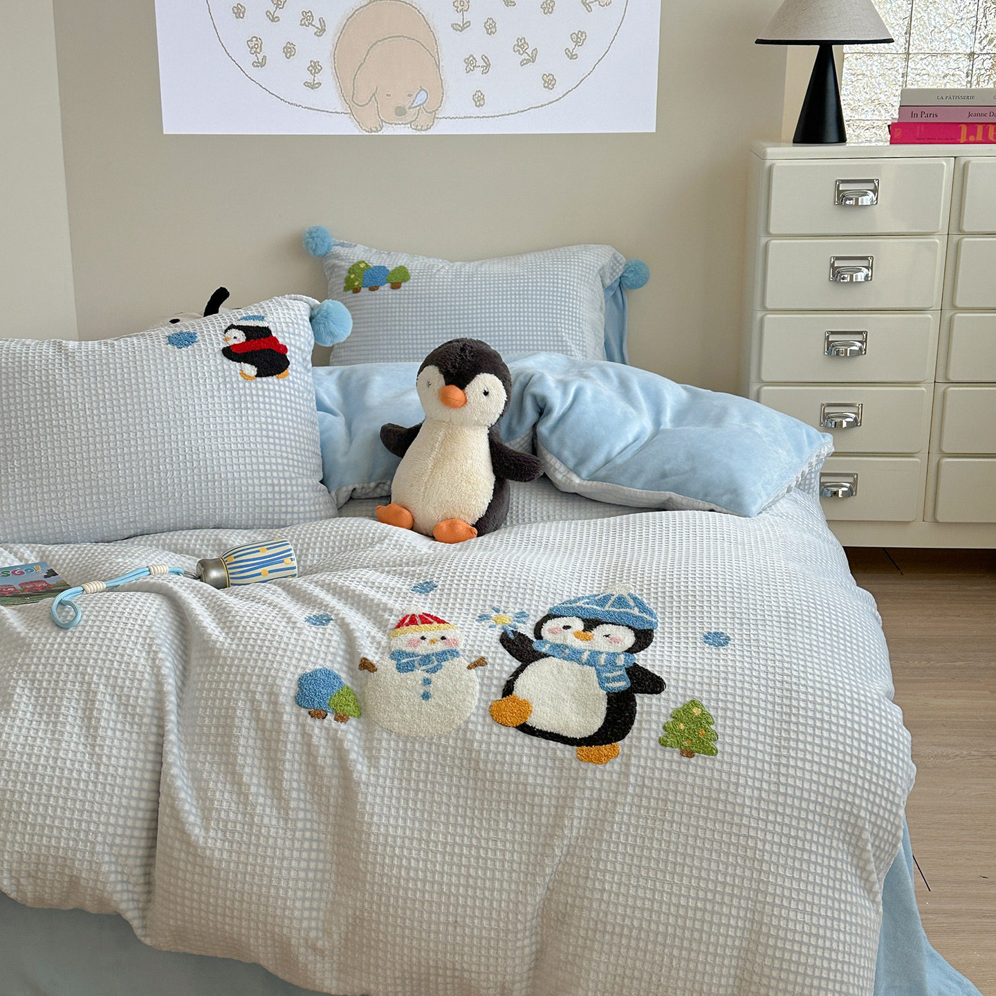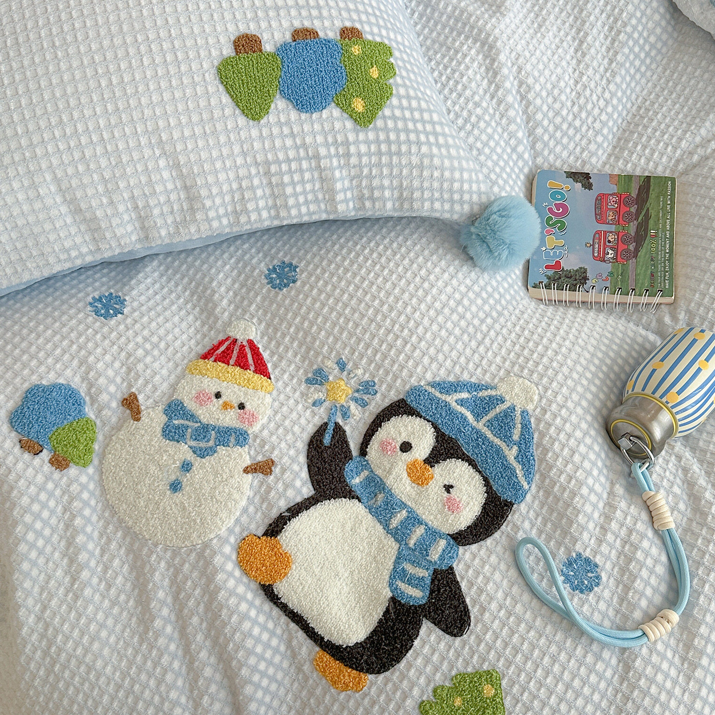 华夫格提花绒刺绣滑雪企鹅牛奶绒四件套珊瑚绒秋冬保暖1.5m1.8米