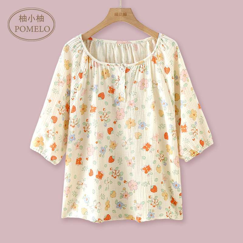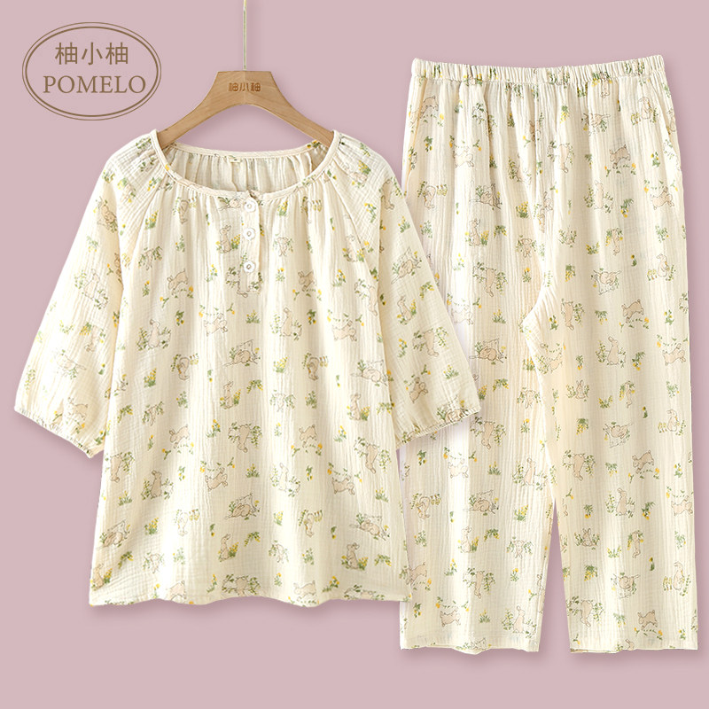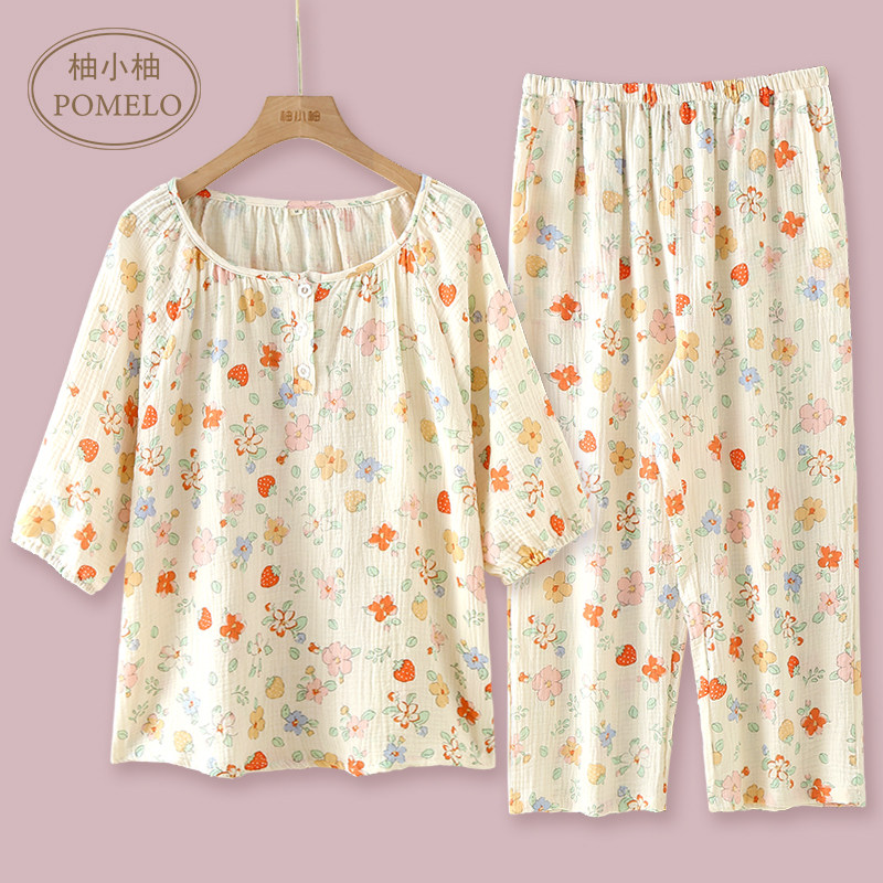春夏薄款纯棉泡泡棉纱布套头甜美碎花七分袖七分裤家居服睡衣套女