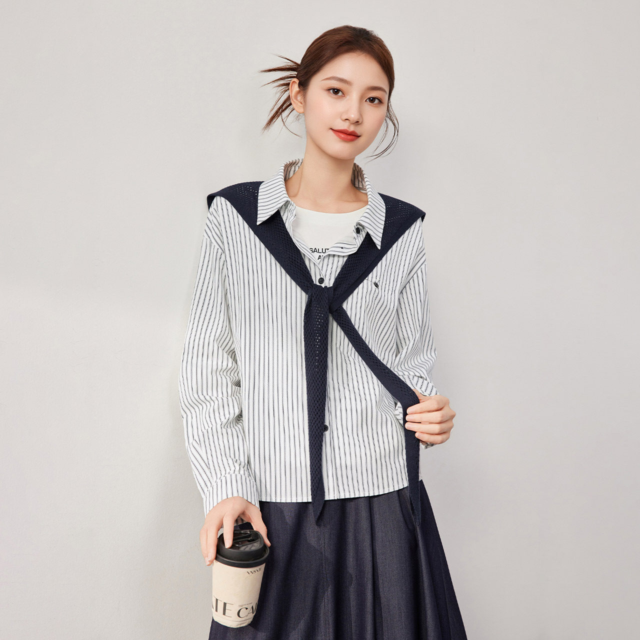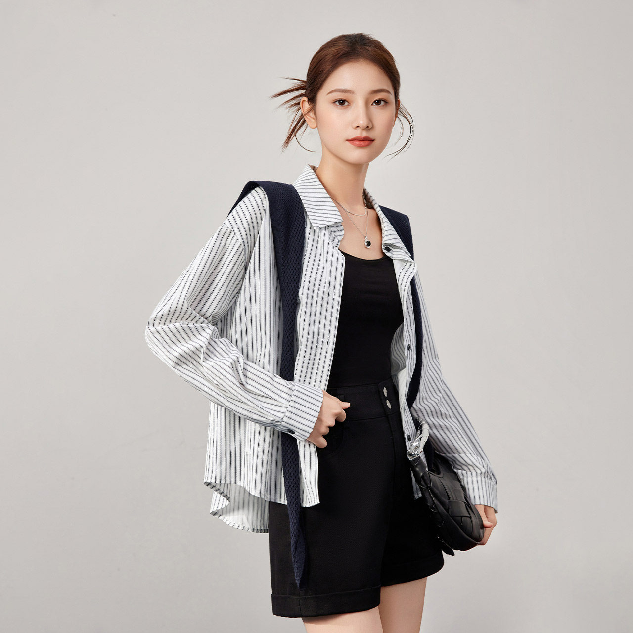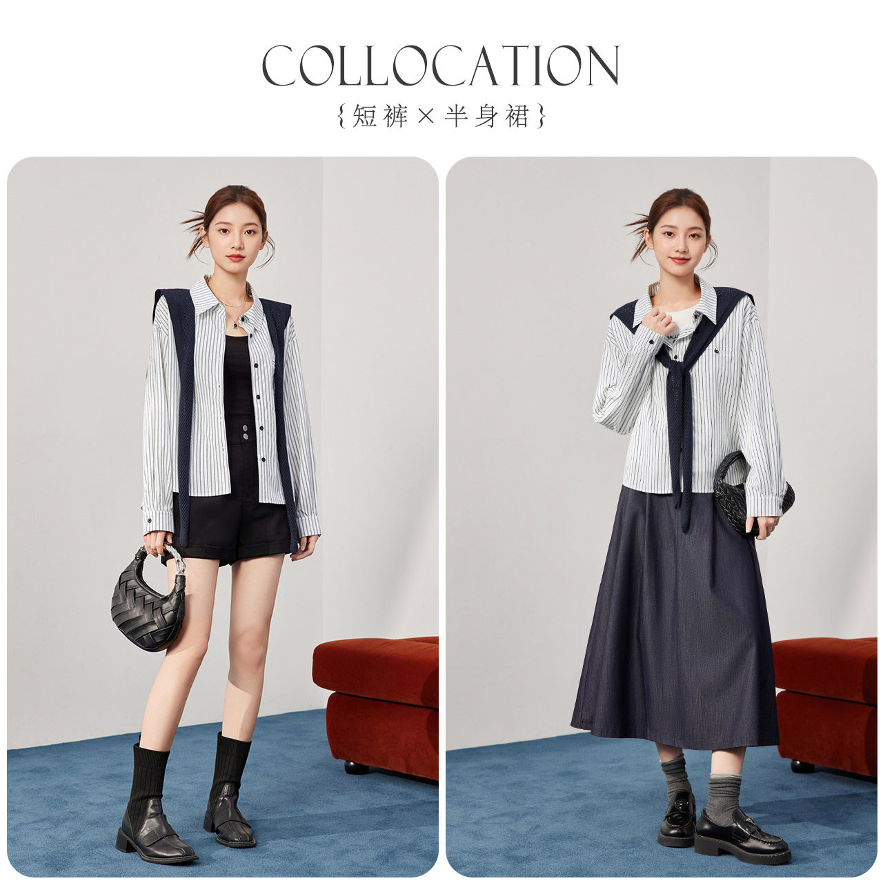 IEF/爱依服2025秋季新款韩版时尚休闲通勤气质条纹带披肩设计衬衫