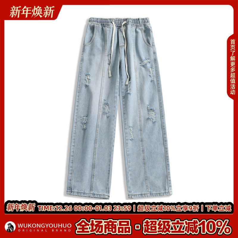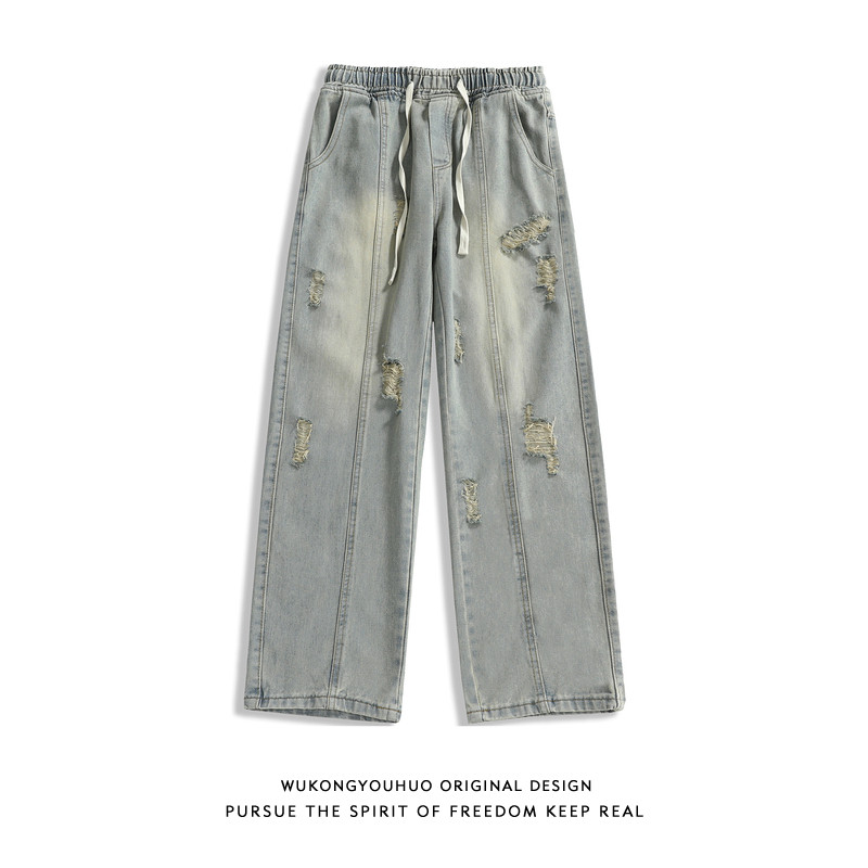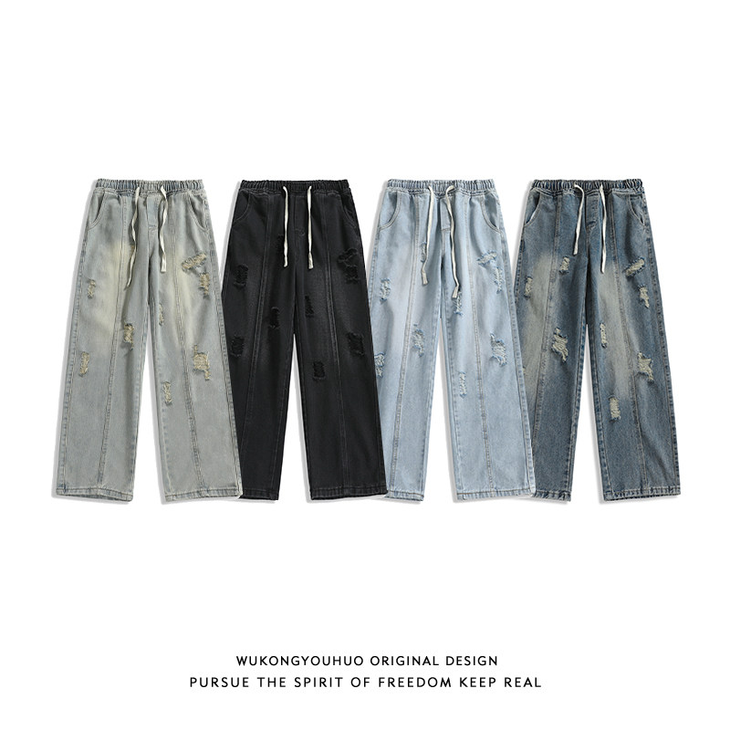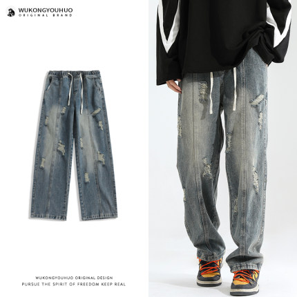 悟空有货美式高街破洞直筒牛仔裤男复古宽松潮流百搭小众拖地长裤